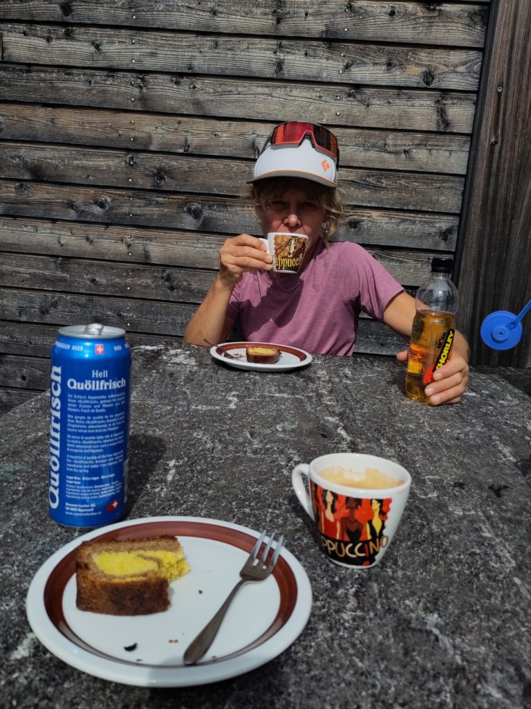 Zwar kamen wir noch einigermassen trocken um den Fil de Nomnom rum, doch danach fing es doch recht kräftig an zu schütten. Da die Hose vom nassen Gras sowieso schon nass bis zu den Knien waren, schenkten wir uns die Regenhose, was uns dann prompt sehr nasse Füsse bescherte. Zwar trocknete die Hose in der nächsten Trockenphase, doch mit Aussicht auf weitere Regengüsse, die nassen Füsse und den weiten Weg vor dem Abstieg wählten wir den steilen, dafür kurzen und sehr schönen Abstieg nach Selma, wo wir uns dank perfektem Timing auch noch Kaffee und Kuchen vor der Rückfahrt nach San Bernardino gönnen konnten.