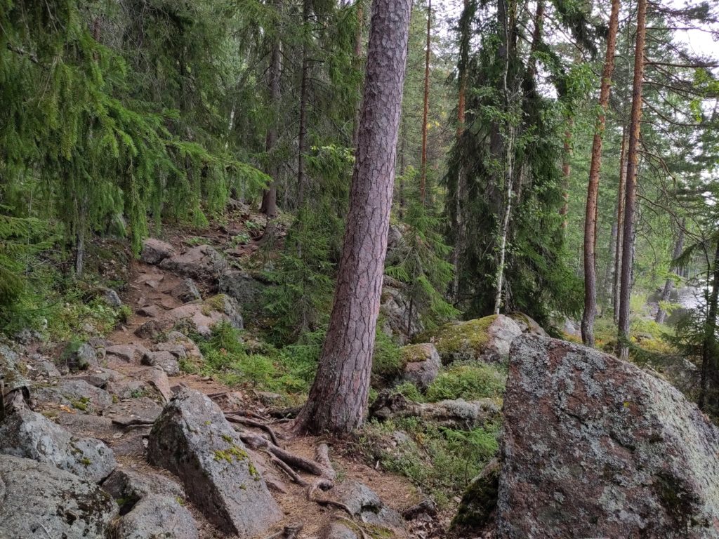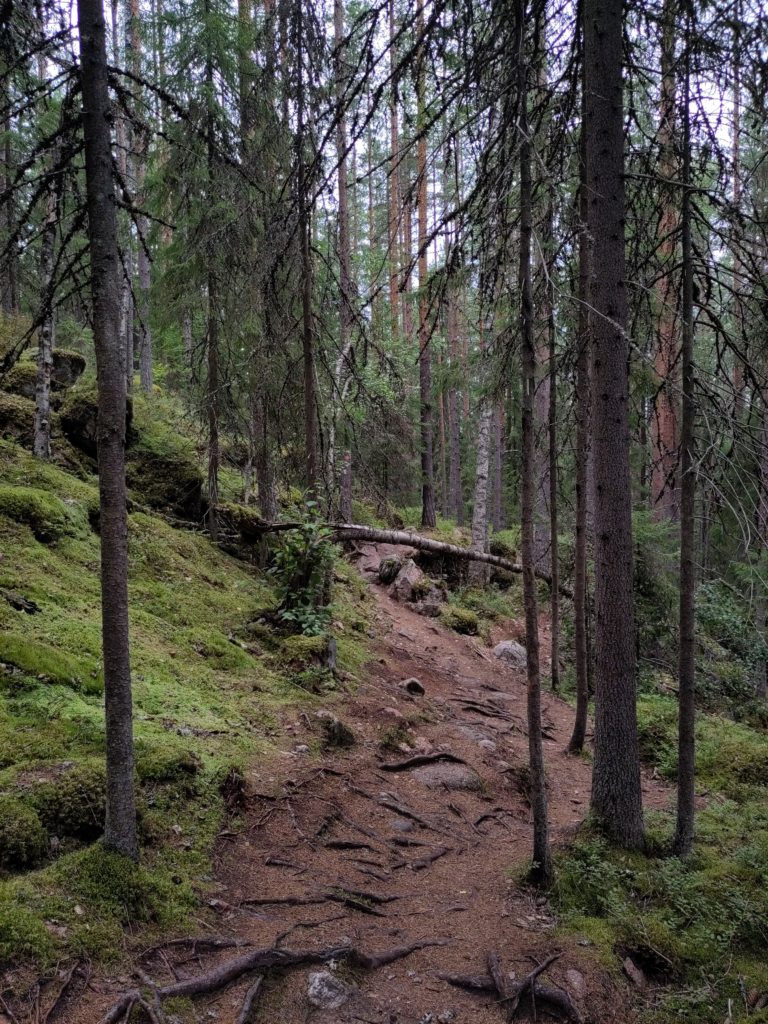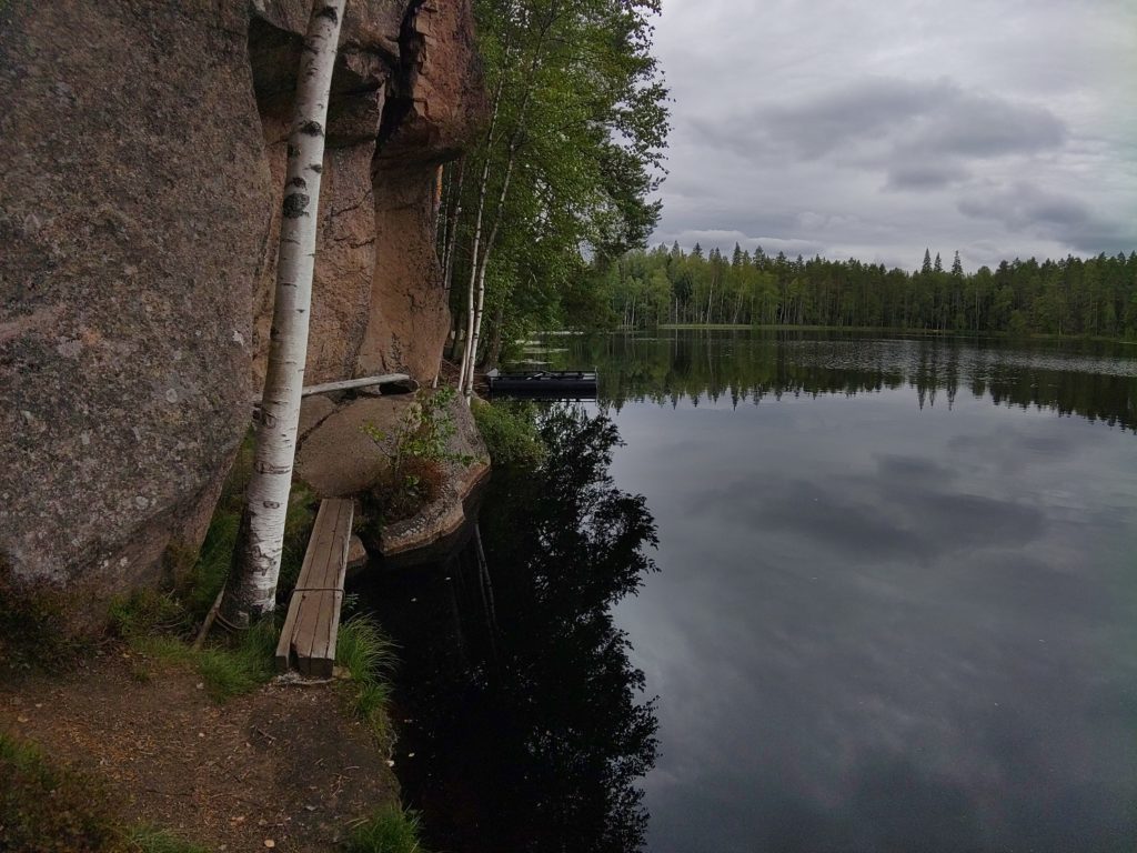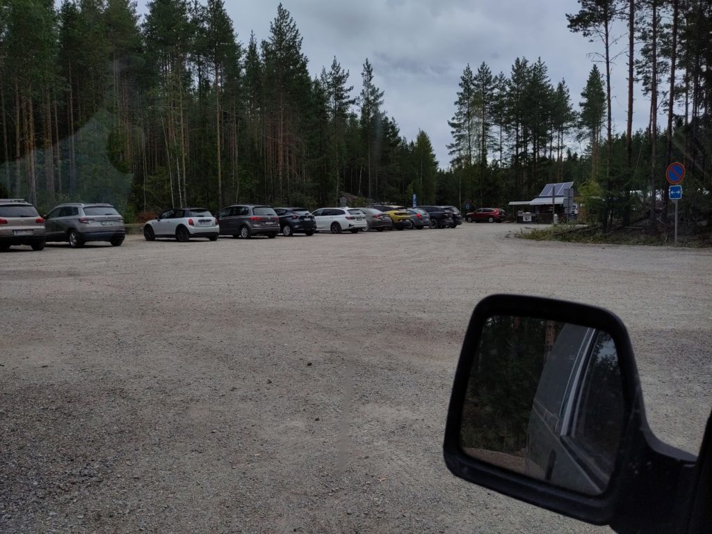 Alles super, könnte mensch meinen. Hätte ich hingegen zuerst geschaut, was alles für Boote da waren, hätte ich mir die Mühen sparen können: es gab leider keine Einer-Kajaks, war also nix mit paddeln. Nun gut, das Wetter war sowieso nicht so einladend, also weiter zum Trailhead in Lapinsalmi, auf viel holperiger Piste (die mit den rumpelnden Querrillen, wo das Auto so gern schwimmt). Dort angekommen traf mich fast der Schlag: da waren an die hundert Autos, und es war klar, dass Einsamkeit an einem Schönwetter-Wochenende in Finnland genauso wenig zu bekommen war wie sonstwo. Nun gut, dachte ich, ich kann mir ja wenigstens das viel gerühmte Klettergebiet am Ohlava-See noch anschauen gehen (das Beste in Finnland!), aber so weit Latschen hatte ich in den vielen Menschen keinen Bock, also fragte ich mein Navi nach dem Weg zum nächsten angegebenen Parkplatz und fuhr los, wieder vor allem Holperpiste, und am Ende kam ich im Trailhead Tervajärvi an und stand vor einer Barriere, obwohl mein Navi noch weiter wollte. Naja, also war von hier doch laufen angesagt.