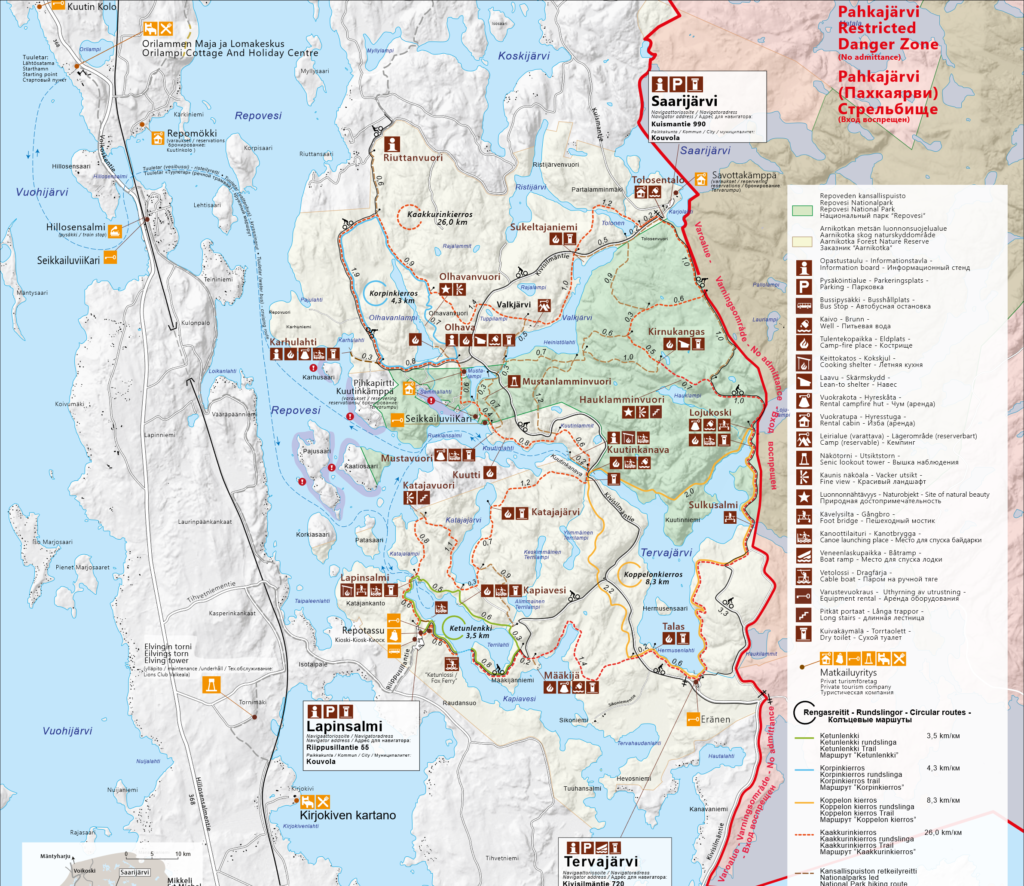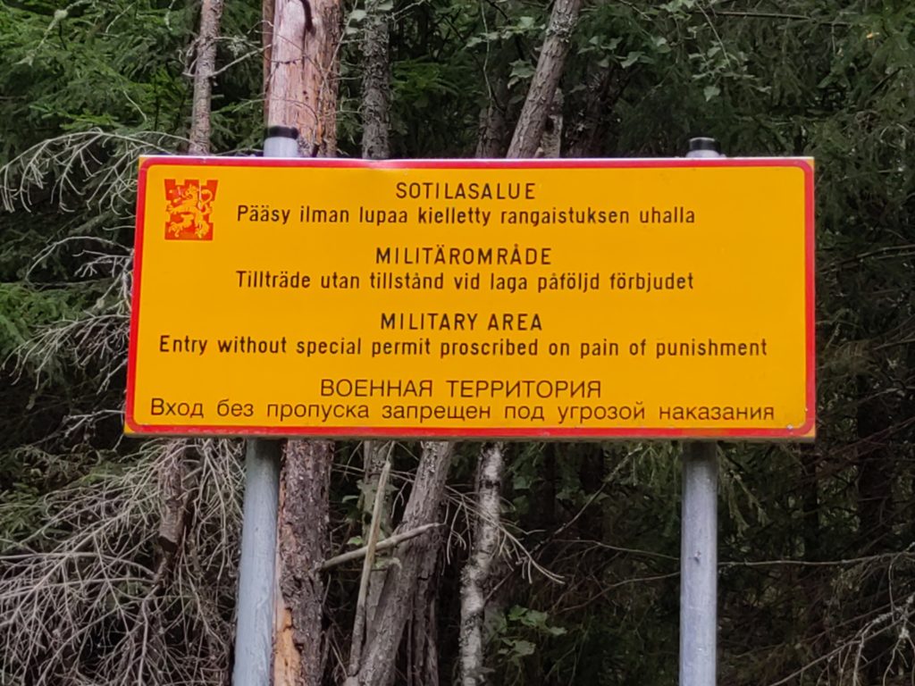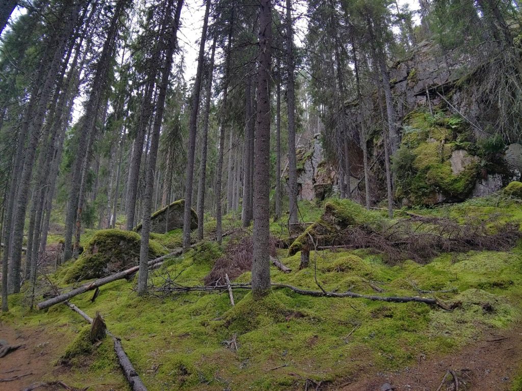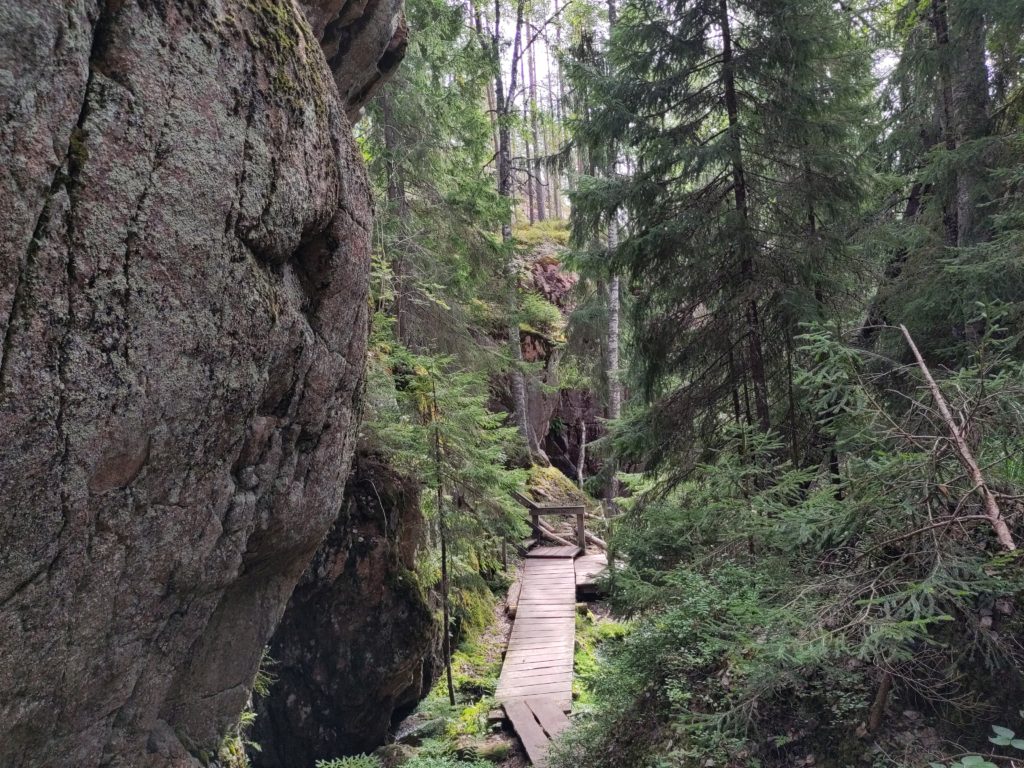 Alles super, könnte mensch meinen. Hätte ich hingegen zuerst geschaut, was alles für Boote da waren, hätte ich mir die Mühen sparen können: es gab leider keine Einer-Kajaks, war also nix mit paddeln. Nun gut, das Wetter war sowieso nicht so einladend, also weiter zum Trailhead in Lapinsalmi, auf viel holperiger Piste (die mit den rumpelnden Querrillen, wo das Auto so gern schwimmt). Dort angekommen traf mich fast der Schlag: da waren an die hundert Autos, und es war klar, dass Einsamkeit an einem Schönwetter-Wochenende in Finnland genauso wenig zu bekommen war wie sonstwo. Nun gut, dachte ich, ich kann mir ja wenigstens das viel gerühmte Klettergebiet am Ohlava-See noch anschauen gehen (das Beste in Finnland!), aber so weit Latschen hatte ich in den vielen Menschen keinen Bock, also fragte ich mein Navi nach dem Weg zum nächsten angegebenen Parkplatz und fuhr los, wieder vor allem Holperpiste, und am Ende kam ich im Trailhead Tervajärvi an und stand vor einer Barriere, obwohl mein Navi noch weiter wollte. Naja, also war von hier doch laufen angesagt.