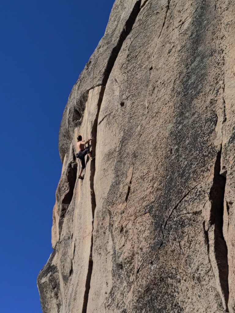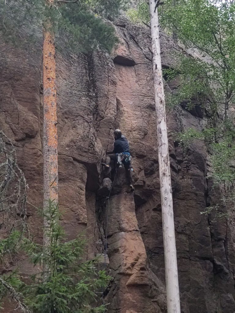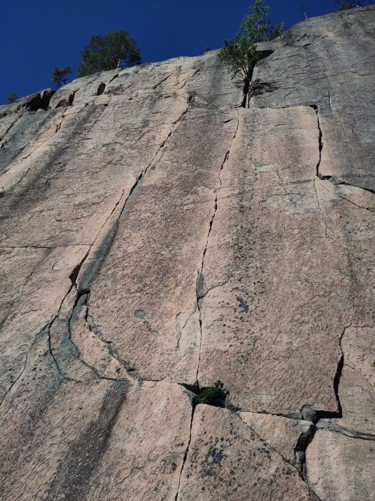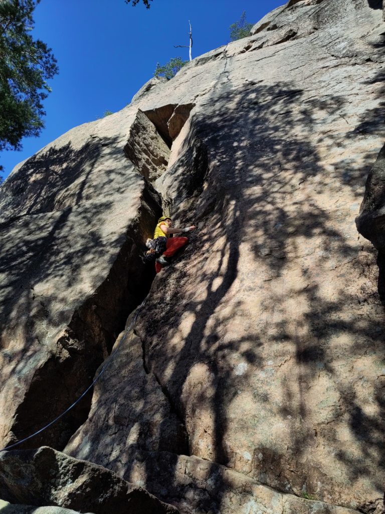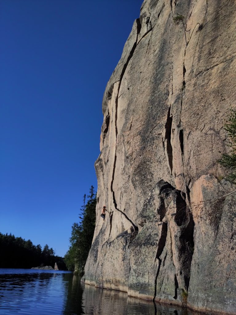 Da unsere Dreierseilschaft erst langsam in die Gänge kam, war ein Kletterkurs bereits in der Route installiert, die sich Sammy für einen Lead-Versuch vornehmen wollte. Kurzerhand wichen wir aus in die Suuri Leikkaus (https://www.thecrag.com/de/klettern/finland/olhava/route/3909356589), eine 6b-Rissverschneidung, dich ich glaub nicht unbedingt hätte so kalt vorsteigen wollen. Sammy hatte auch einen gehörigen Kampf, bis er oben war, von wo aus er mich dann nachsicherte. So gemütlich im Nachstieg hatte ich in der Route sehr viel Vergnügen und konnte Stemmen, Spreizen und Klemmen nach Herzenslust und ohne Stress. Danach war aber genug geklettert für meine Schulter, spürte ich, und ich widerstand der Versuchung, die Kantti noch zu machen. Stattdessen sicherte ich und machte Fotos, auch als Dank, dass ich so spontan mittun durfte.