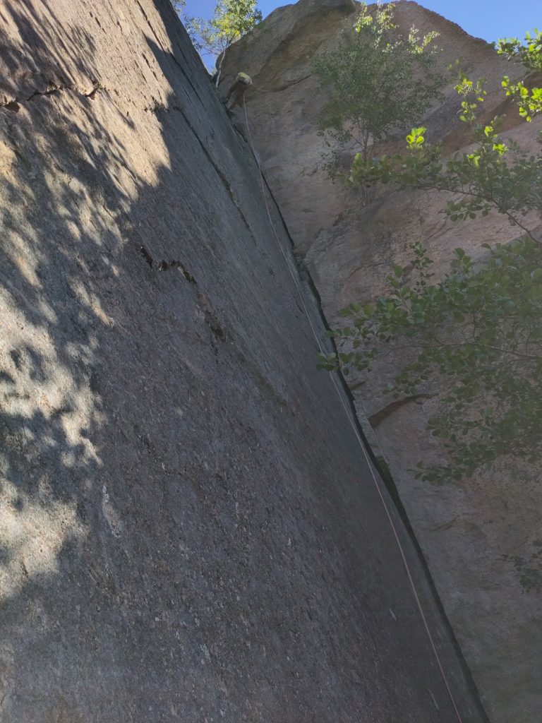 Natürlich wählte ich nicht die Radfahrbare Strasse als Weg, sondern einen schöneren, mit einigem Auf und Ab, und so kam ich erst mitten am Nachmittag an. Roope war auf dem Inselchen am Klettern und auch sonst war der Zeltplatz gerammelt voll. Ich mich also erst mal irgendwo dazwischengequetscht mit meinem Zeug und gewartet, und später auch mein Nachtessen schon mal verspeist, als Roope und Sammy von der Insel zurück waren. Sie würden nach einer Pause nochmal los, ob ich dann mitwolle. Und ob ich wollte! Zuerst übte Roope in einer 7a+ (Los Capitanos) die Moves, danach wollte Sammy noch etwas Einfacheres klettern, und so kam ich zu einer wunderbaren Sundowner-Route im Toprope vom Cliffhead aus, einer schön griffigen, eher soften 6a+ namens Josse, mit schönen Käntchen und angenehmen Fingerrissen (https://27crags.com/crags/olhava).