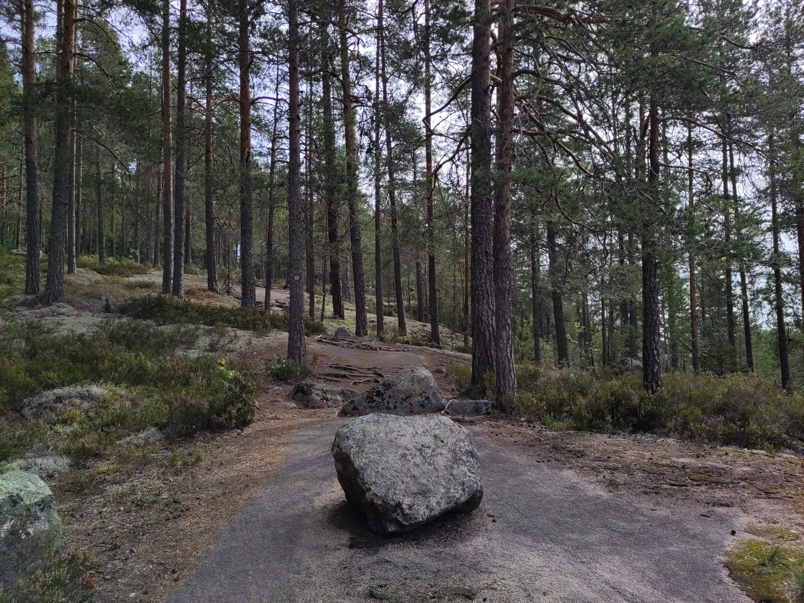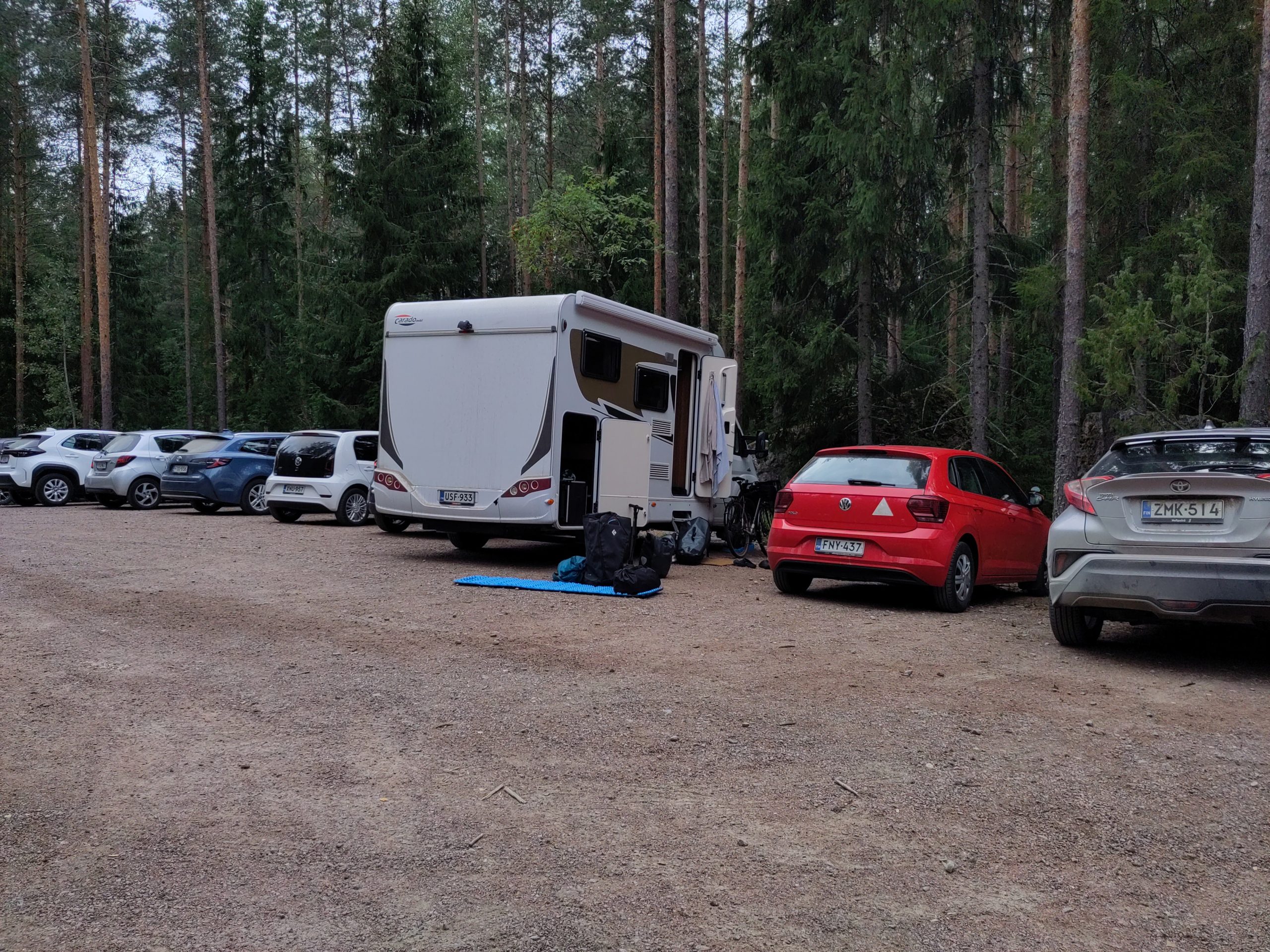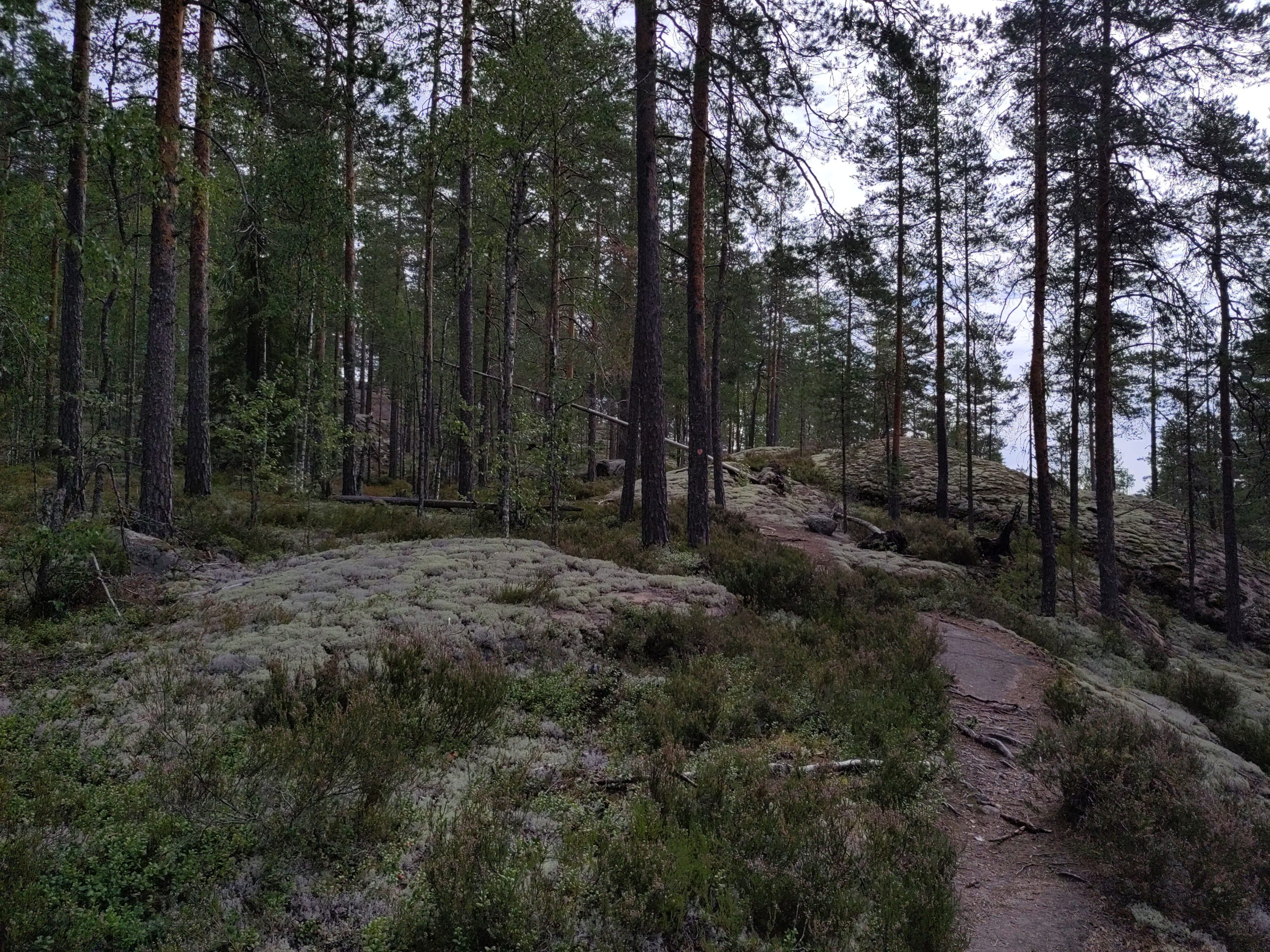 Alles super, könnte mensch meinen. Hätte ich hingegen zuerst geschaut, was alles für Boote da waren, hätte ich mir die Mühen sparen können: es gab leider keine Einer-Kajaks, war also nix mit paddeln. Nun gut, das Wetter war sowieso nicht so einladend, also weiter zum Trailhead in Lapinsalmi, auf viel holperiger Piste (die mit den rumpelnden Querrillen, wo das Auto so gern schwimmt). Dort angekommen traf mich fast der Schlag: da waren an die hundert Autos, und es war klar, dass Einsamkeit an einem Schönwetter-Wochenende in Finnland genauso wenig zu bekommen war wie sonstwo. Nun gut, dachte ich, ich kann mir ja wenigstens das viel gerühmte Klettergebiet am Ohlava-See noch anschauen gehen (das Beste in Finnland!), aber so weit Latschen hatte ich in den vielen Menschen keinen Bock, also fragte ich mein Navi nach dem Weg zum nächsten angegebenen Parkplatz und fuhr los, wieder vor allem Holperpiste, und am Ende kam ich im Trailhead Tervajärvi an und stand vor einer Barriere, obwohl mein Navi noch weiter wollte. Naja, also war von hier doch laufen angesagt.