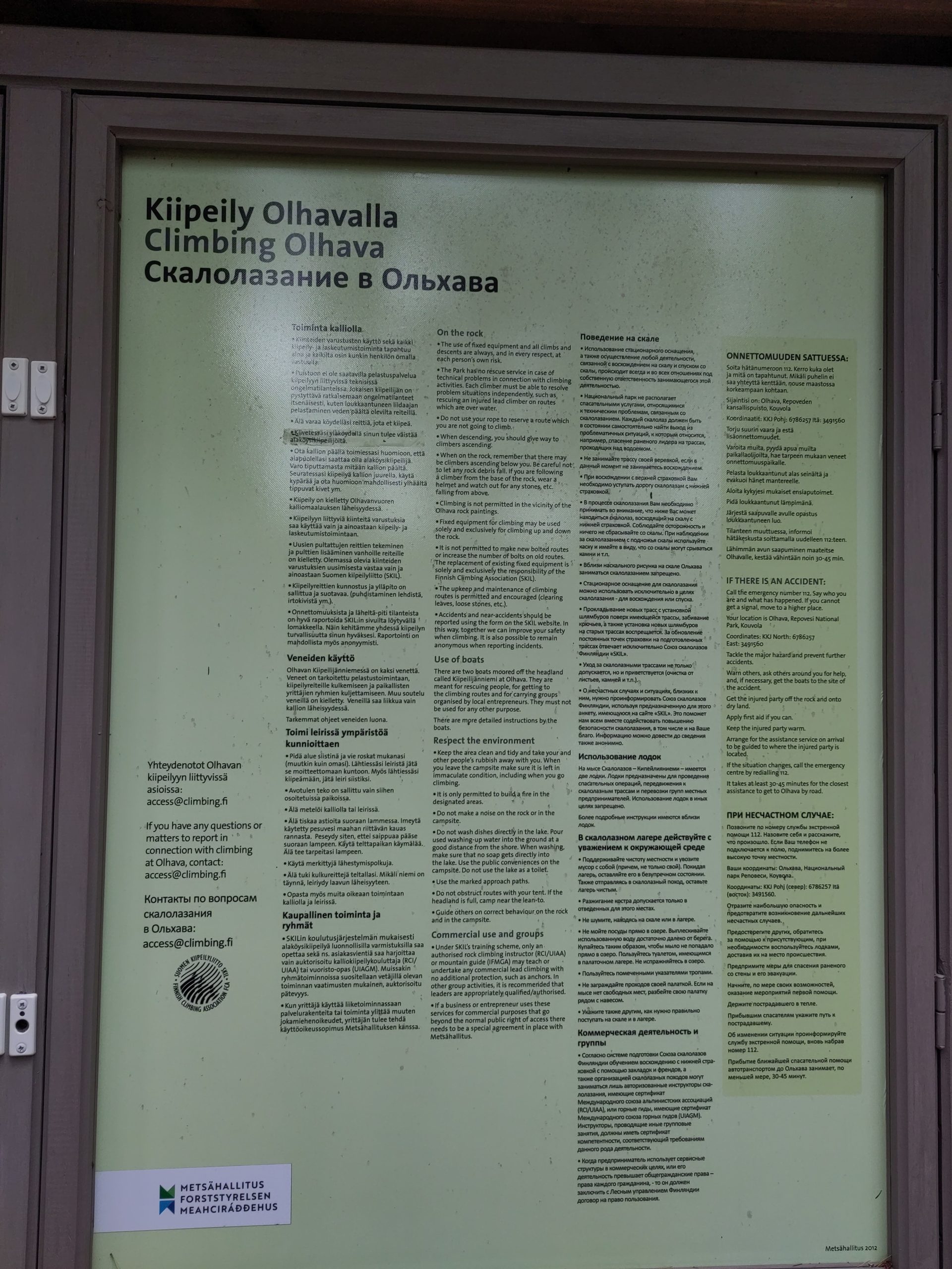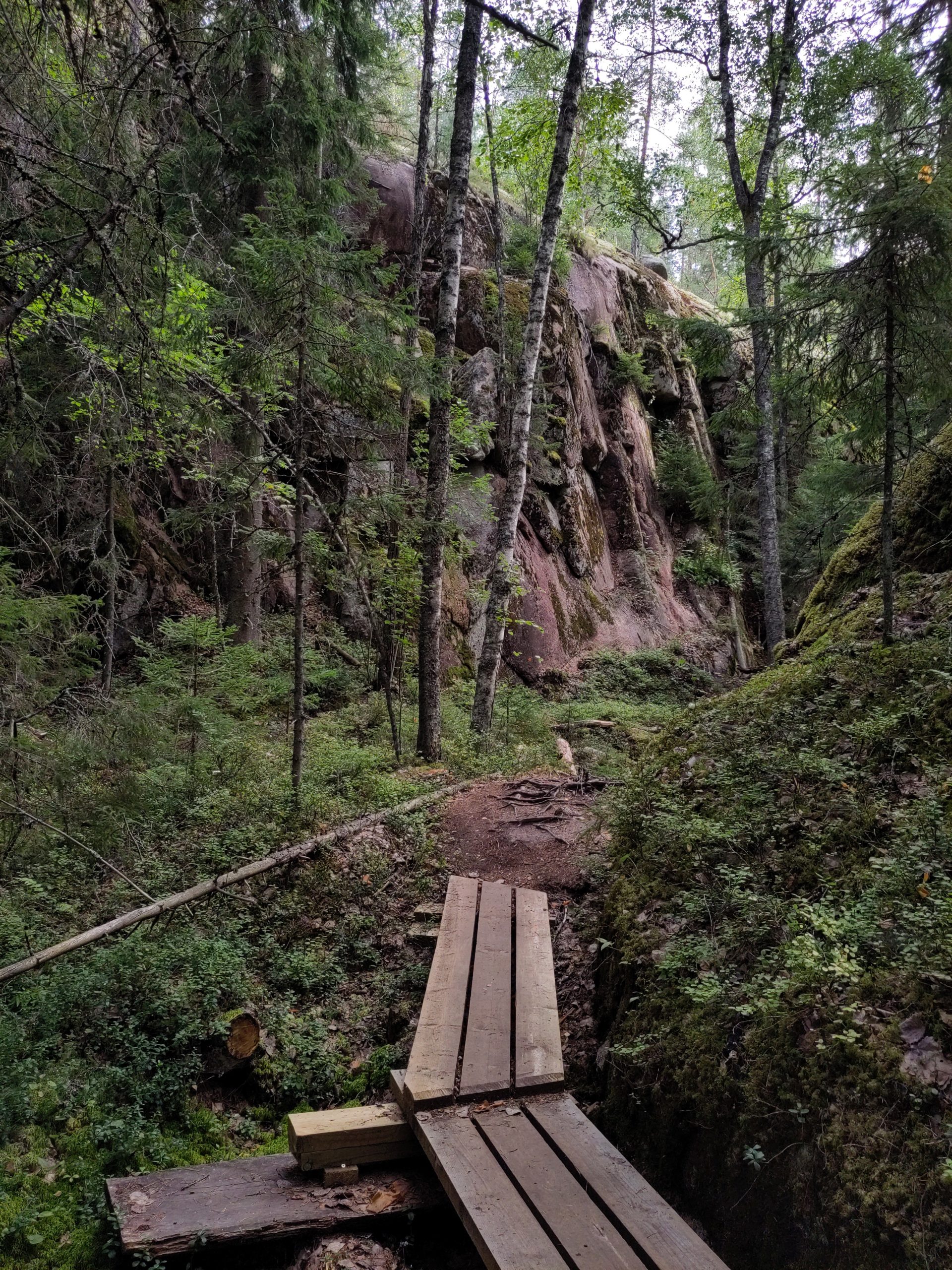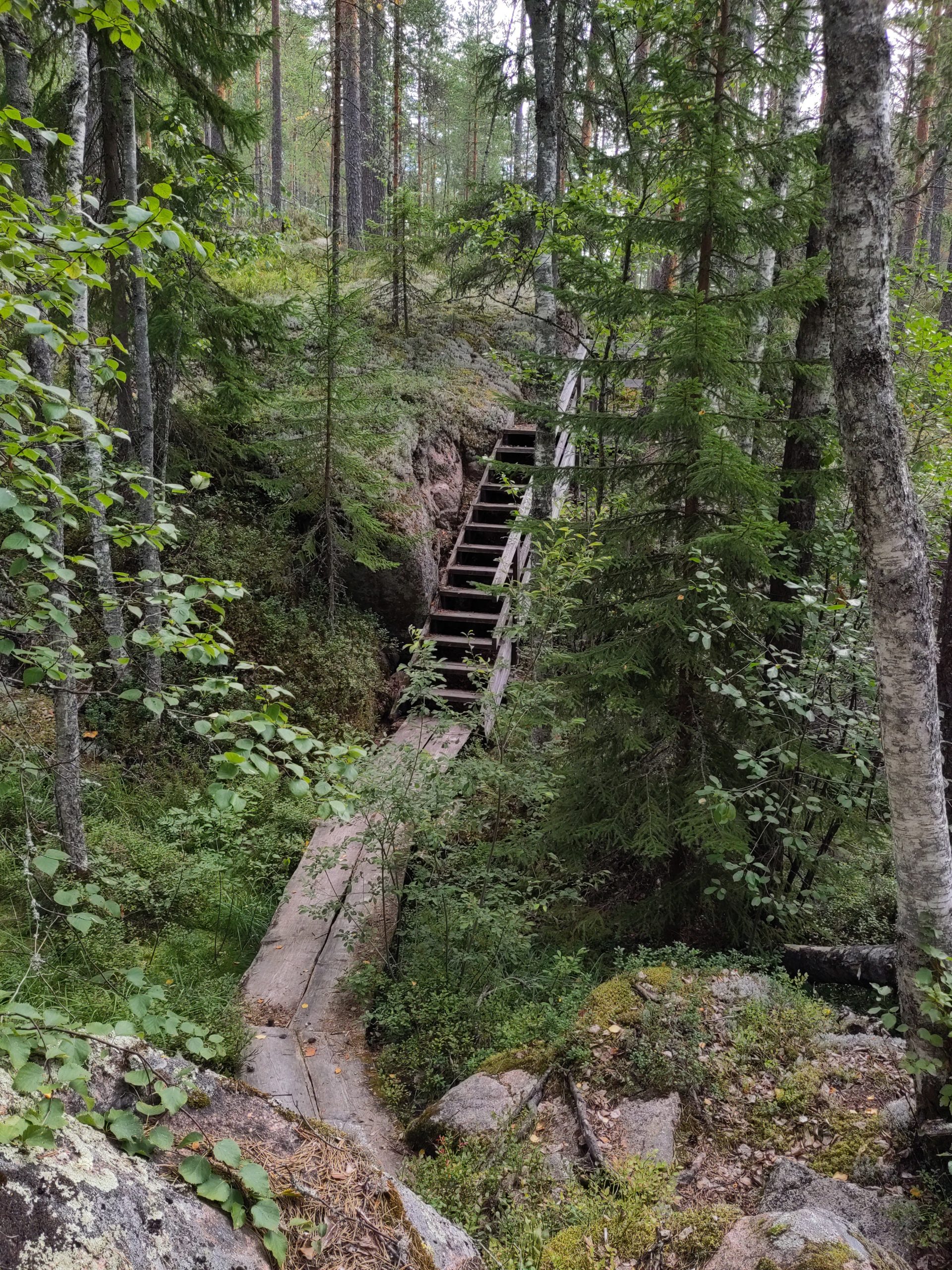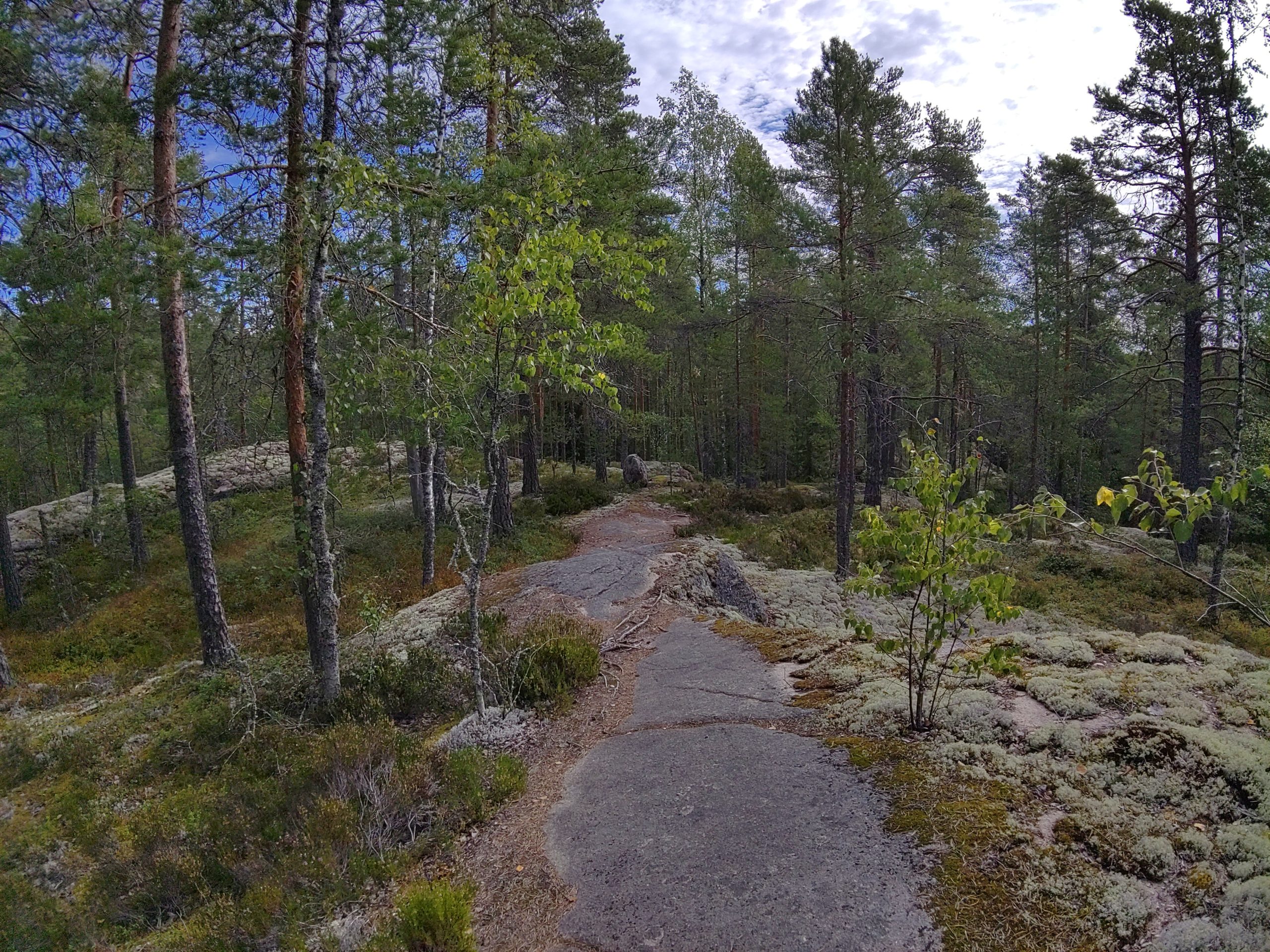 Alles super, könnte mensch meinen. Hätte ich hingegen zuerst geschaut, was alles für Boote da waren, hätte ich mir die Mühen sparen können: es gab leider keine Einer-Kajaks, war also nix mit paddeln. Nun gut, das Wetter war sowieso nicht so einladend, also weiter zum Trailhead in Lapinsalmi, auf viel holperiger Piste (die mit den rumpelnden Querrillen, wo das Auto so gern schwimmt). Dort angekommen traf mich fast der Schlag: da waren an die hundert Autos, und es war klar, dass Einsamkeit an einem Schönwetter-Wochenende in Finnland genauso wenig zu bekommen war wie sonstwo. Nun gut, dachte ich, ich kann mir ja wenigstens das viel gerühmte Klettergebiet am Ohlava-See noch anschauen gehen (das Beste in Finnland!), aber so weit Latschen hatte ich in den vielen Menschen keinen Bock, also fragte ich mein Navi nach dem Weg zum nächsten angegebenen Parkplatz und fuhr los, wieder vor allem Holperpiste, und am Ende kam ich im Trailhead Tervajärvi an und stand vor einer Barriere, obwohl mein Navi noch weiter wollte. Naja, also war von hier doch laufen angesagt.