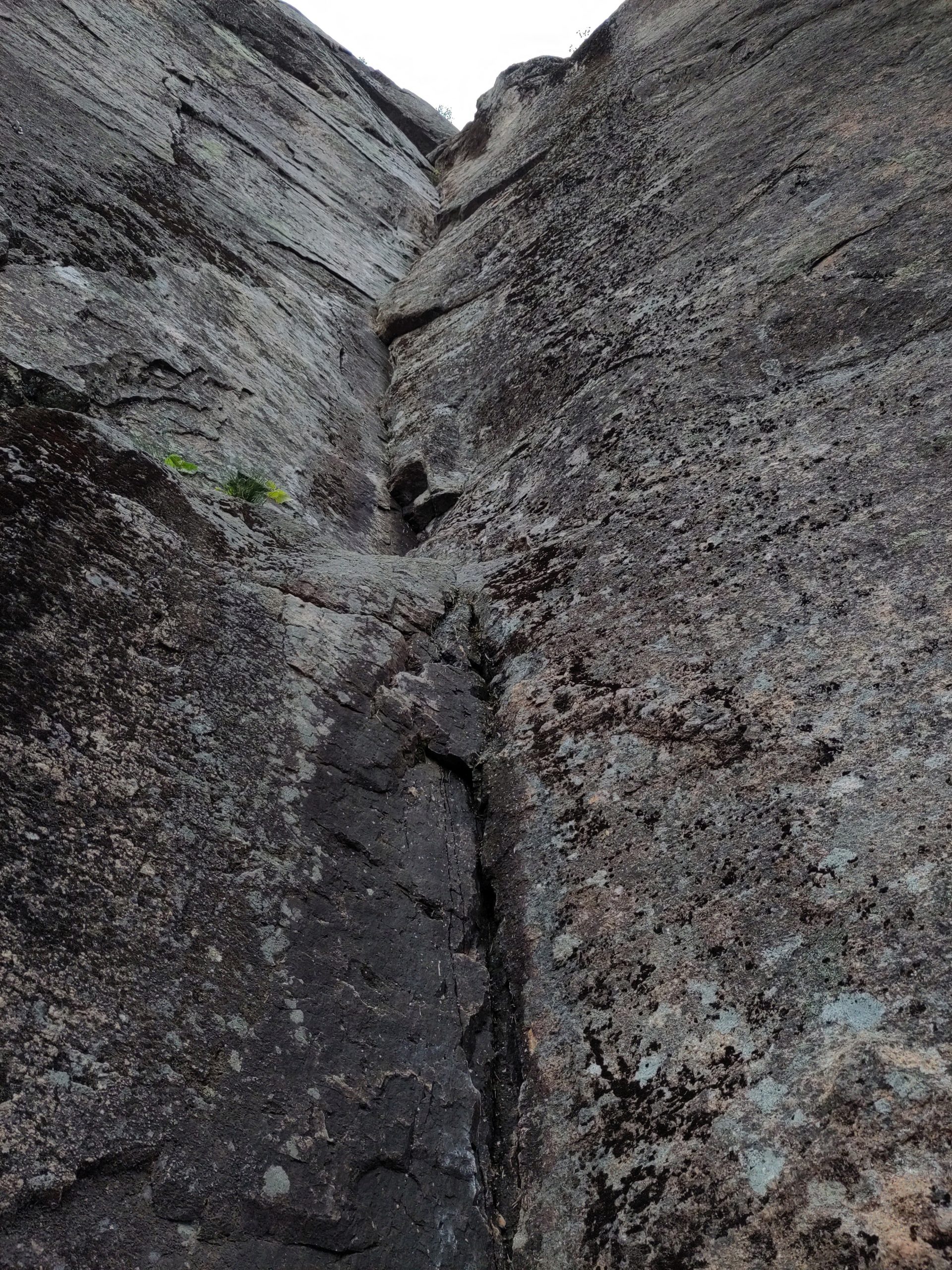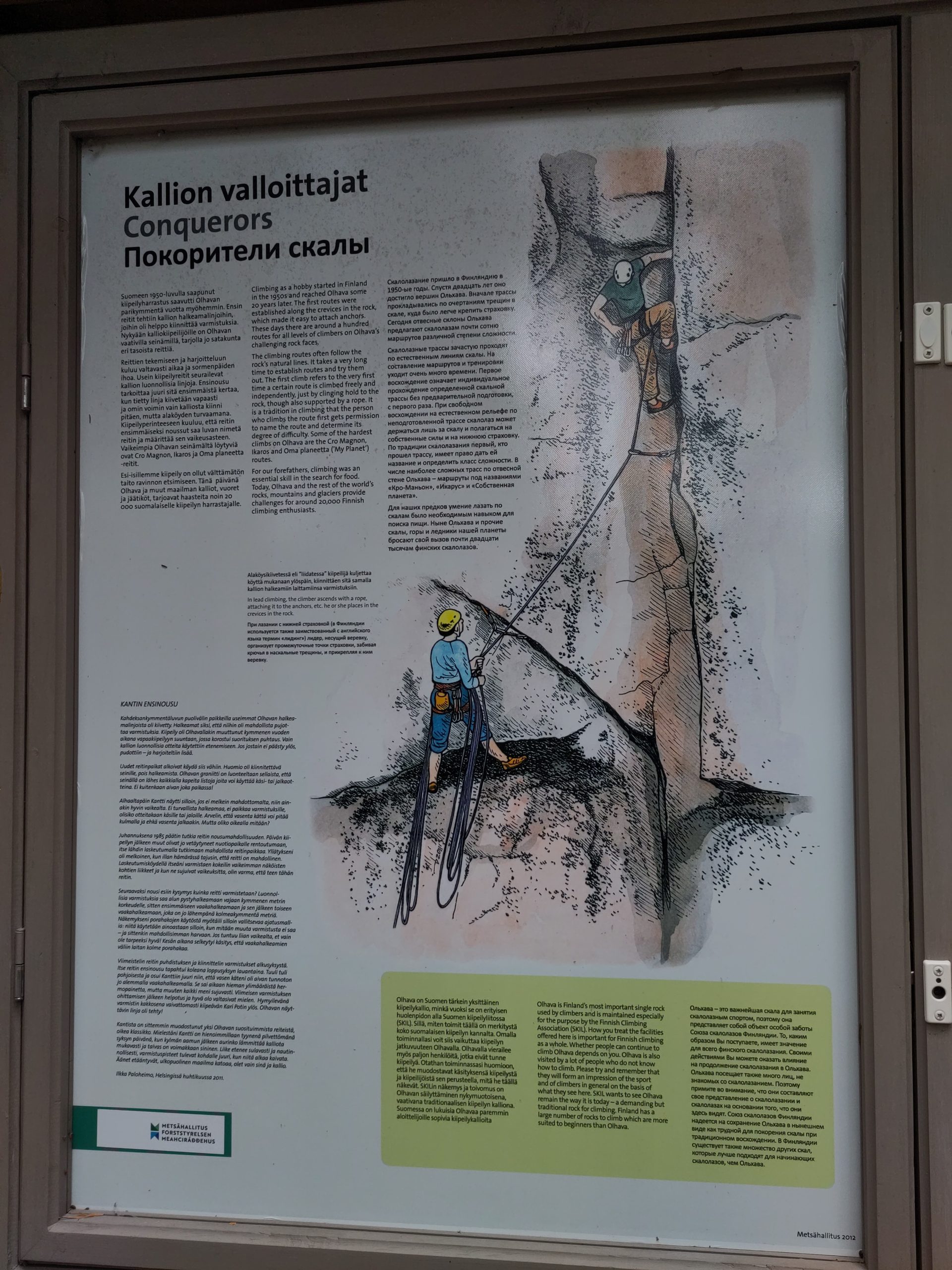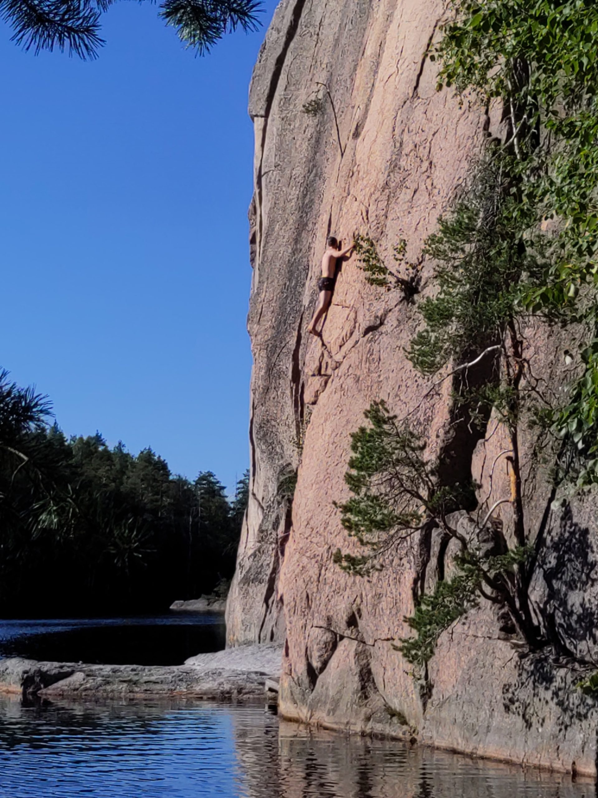 Da unsere Dreierseilschaft erst langsam in die Gänge kam, war ein Kletterkurs bereits in der Route installiert, die sich Sammy für einen Lead-Versuch vornehmen wollte. Kurzerhand wichen wir aus in die Suuri Leikkaus (https://www.thecrag.com/de/klettern/finland/olhava/route/3909356589), eine 6b-Rissverschneidung, dich ich glaub nicht unbedingt hätte so kalt vorsteigen wollen. Sammy hatte auch einen gehörigen Kampf, bis er oben war, von wo aus er mich dann nachsicherte. So gemütlich im Nachstieg hatte ich in der Route sehr viel Vergnügen und konnte Stemmen, Spreizen und Klemmen nach Herzenslust und ohne Stress. Danach war aber genug geklettert für meine Schulter, spürte ich, und ich widerstand der Versuchung, die Kantti noch zu machen. Stattdessen sicherte ich und machte Fotos, auch als Dank, dass ich so spontan mittun durfte.