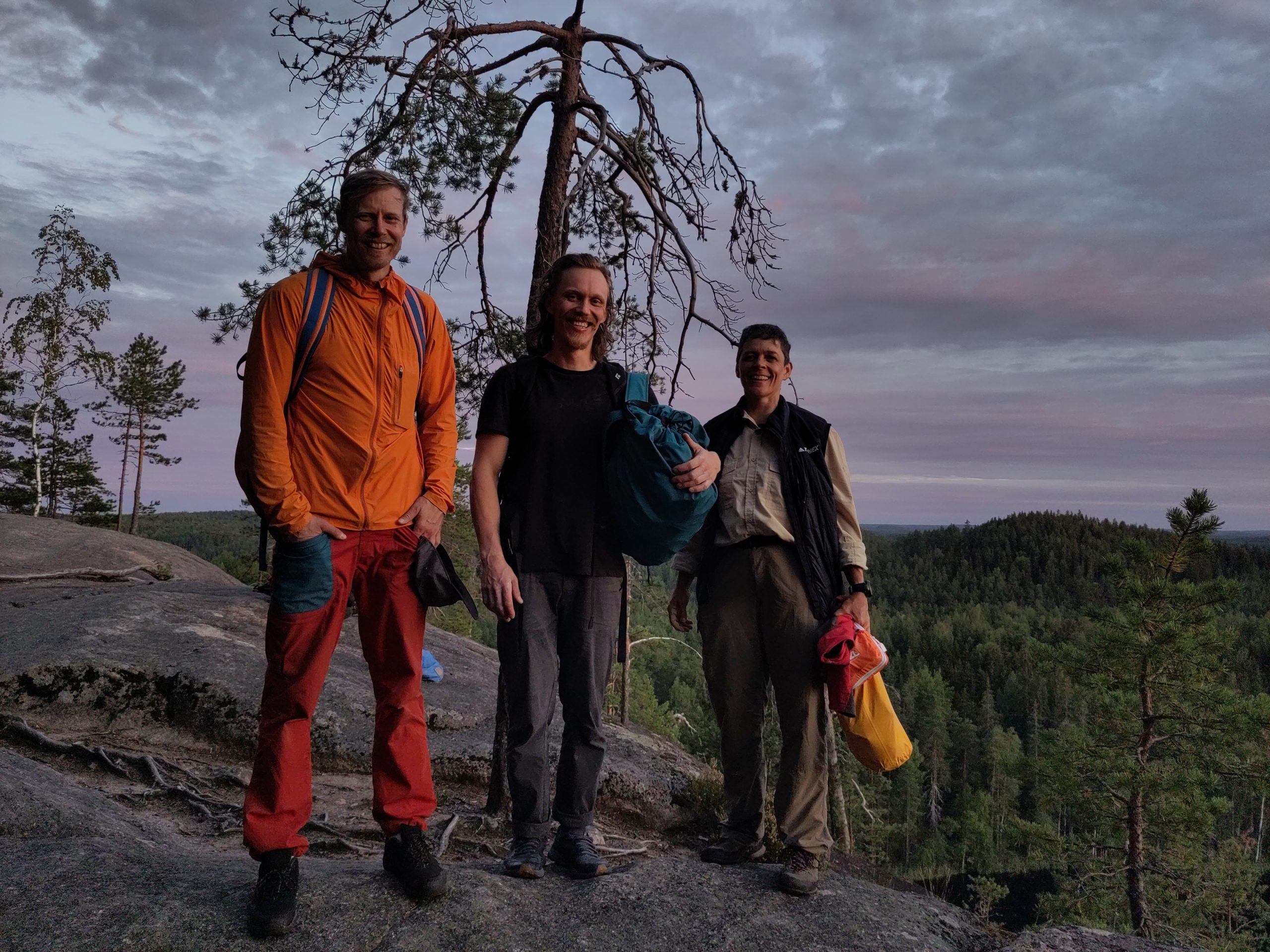 Am zweiten Abend tauten dann auch die schüchternsten Finnen noch auf, und dann wollten sie kaum mehr aufhören zu berichten, und radebrechten in bestmöglichem Englisch, wo es toll sei zum Bouldern (Aland), welche Pilze ich noch sammeln könnte (sah gfürchig uneindeutig aus, ich werd’s lassen) und was sie sonst noch so alles geklettert haben in ihrer Woche Urlaub, in der sie überall hin mit Zug und Velo gereist sind. Geschlafen haben die beiden in Hängematte mit Tarp/Moskitonetz drüber. Eine in Deutschland lebende italienische Familie aus Padova mit Tochter im Finnland-Jahr teilte ihre sämtlichen Leftovers mit uns, ich schickte ihnen dafür die liebevoll übersetze deutsche Kanu-Ausleih-Anleitung für Hillosensalmi. Hugo, der anfangs so schüchterne Bio-Mediziner erzählte, bevor er sich dann auch auf den Weg nach Hause machte noch von seinen alpinen Abenteuern im Ecrins-Massiv (hat da irgendeine Wand geklettert).