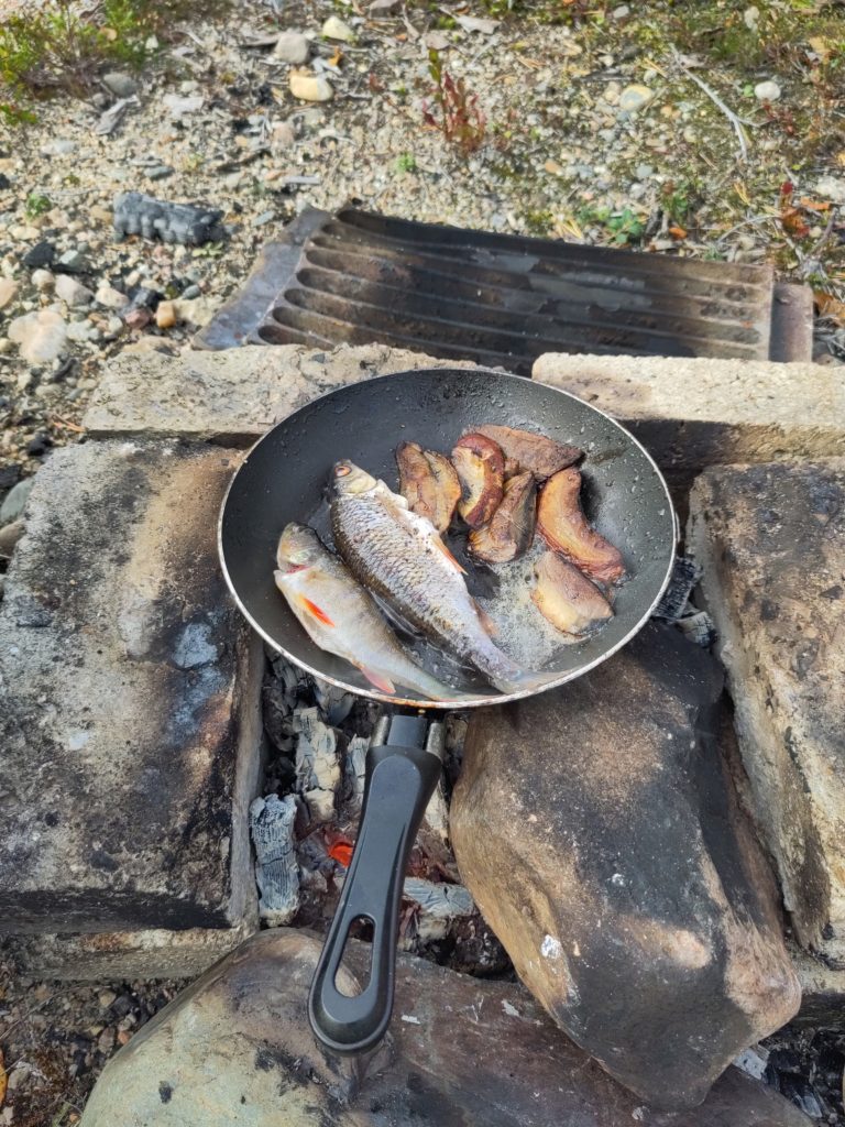 Der Spot entpuppte sich als echtes Schmuckstück. Zwar mit einem Schild, das Camping verboten ist, aber das störte mich ja nicht, ich wollte hier ja bloss fischen, abhängen, essen und mich wieder menschentauglich machen. Die schöne Schutzhütte liess ich unangetastet, dafür war viel zu gutes Wetter; stattdessen feuerte ich draussen ein und machte schon mal die Pilze startklar, die noch weggefuttert werden mussten. Aber so ein Fisch überm Feuer, das wär schon schön, also flink am Badesteg die Angel ausgeworfen (eingetunkt trifft es eher), weiss ich doch, dass Fische gerne unter solchen Stegen hocken. Und prompt hatte ich ein dickliches Rotauge an der Angel.
