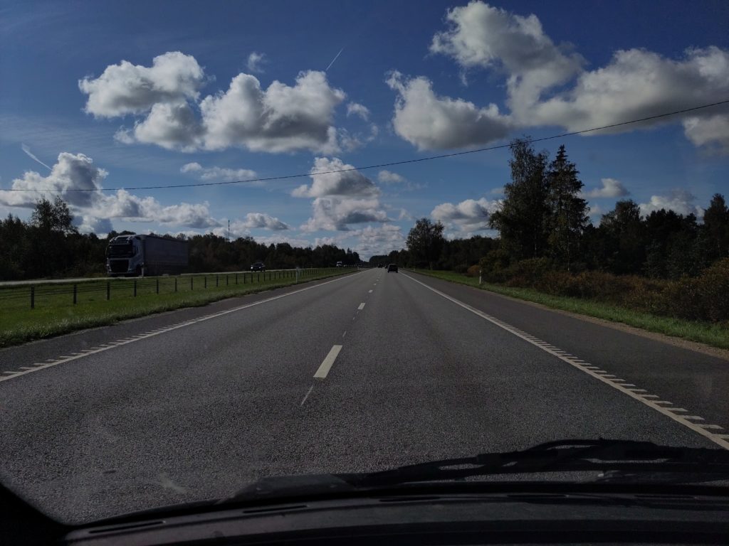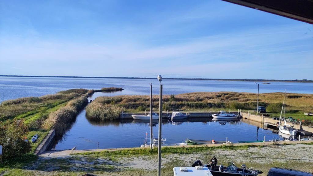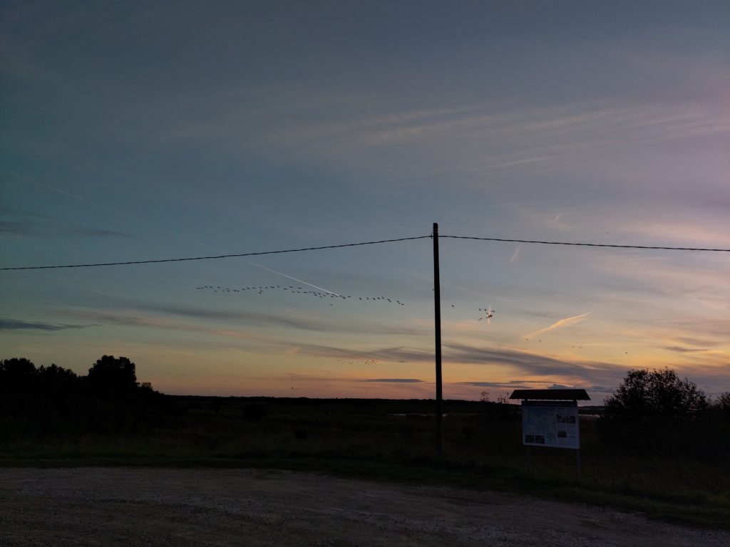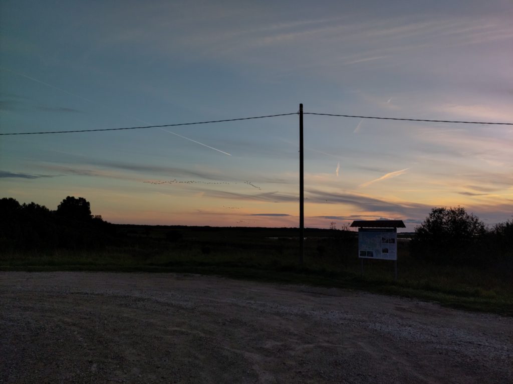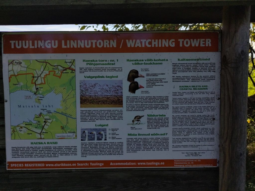 Ich halte noch beim Info-Center in Penjiöe, und das ist eine gute Idee: Auf dem Parkplatz mach ich mir noch einen Kaffee, als ich endlich auf die Ursache des unglaublich lauten Vogellärms komme, den ich zuvor an/in der Scheune verortet hatte: ca. tausend Kraniche machen sich auf, weiterzufliegen, und ich kann ihnen grade noch nachschauen mit meinem Feldi, Wow! Und im Center bestätigt mir eine kompetente Frau, dass gestern ungefahr zweitausend Kraniche gelandet seien, und dass es gut möglich sei, bei dem guten Wetter, sass sie gleich weiterziehen. Ausserdem gibt sie mir Tipps, bei welchem Turm wie das Gelände und was zu sehen ist, und ja, beim Keemu-Turm würden auch immer einige übernachten. Zum Abschluss gibt’s auch noch eine wunderbare Diaschau mit deutschen Voice-over, die alle Vögel und andere Tiere im Jahreszyklus in Matsalu zeigt, wunderbar.