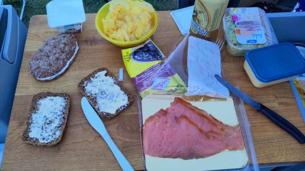 Es waren ja auch schon welche vor Ort, die fuhren raus zum Fischen, und ich grüsste sie, als sie zurückkamen, während ich meine Stipp-Angel vergeblich ins Wasser hielt. Die meisten gingen dann auch. Drei blieben da, bei ihrem WoMo. Irgendwann kam dann noch einer, und der liess auch die ganze Zeit den Motor laufen. Ich war da schon längst im Auto am Weiterplanen, als die Stimmen plötzlich nah beim Glamper waren. Und dann schubste einer am Auto, und sagte mehrmals, How do you do. Der klang eher betrunken, und ich antwortete nicht. Sie verzogen sich wieder und ich werweisste, was ich jetzt tun sollte und löschte erst mal das Licht.