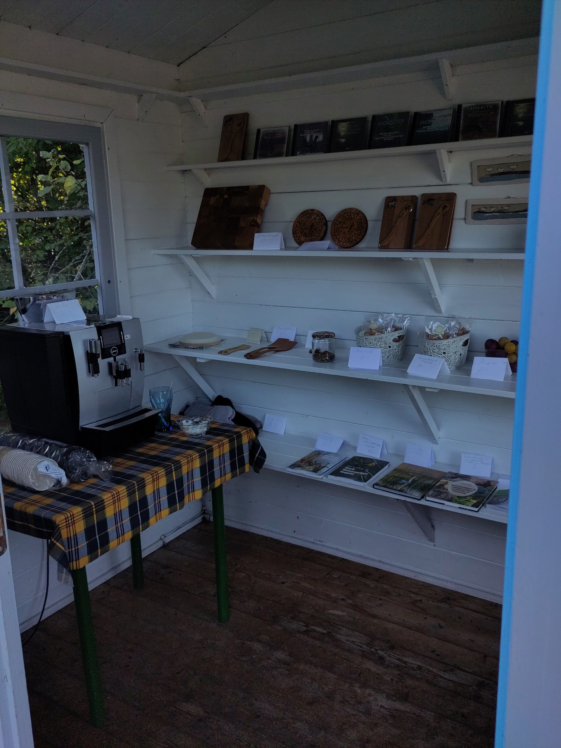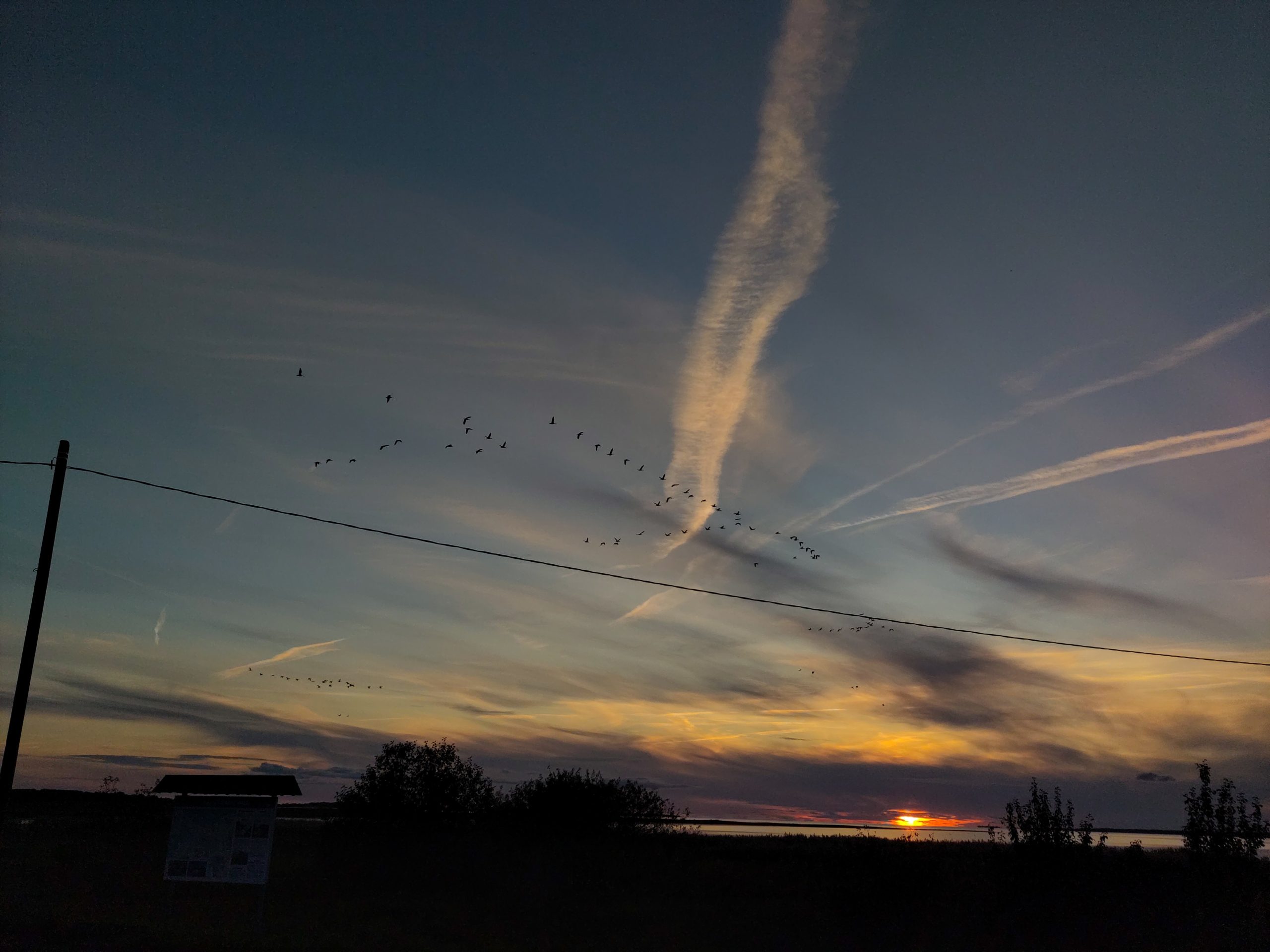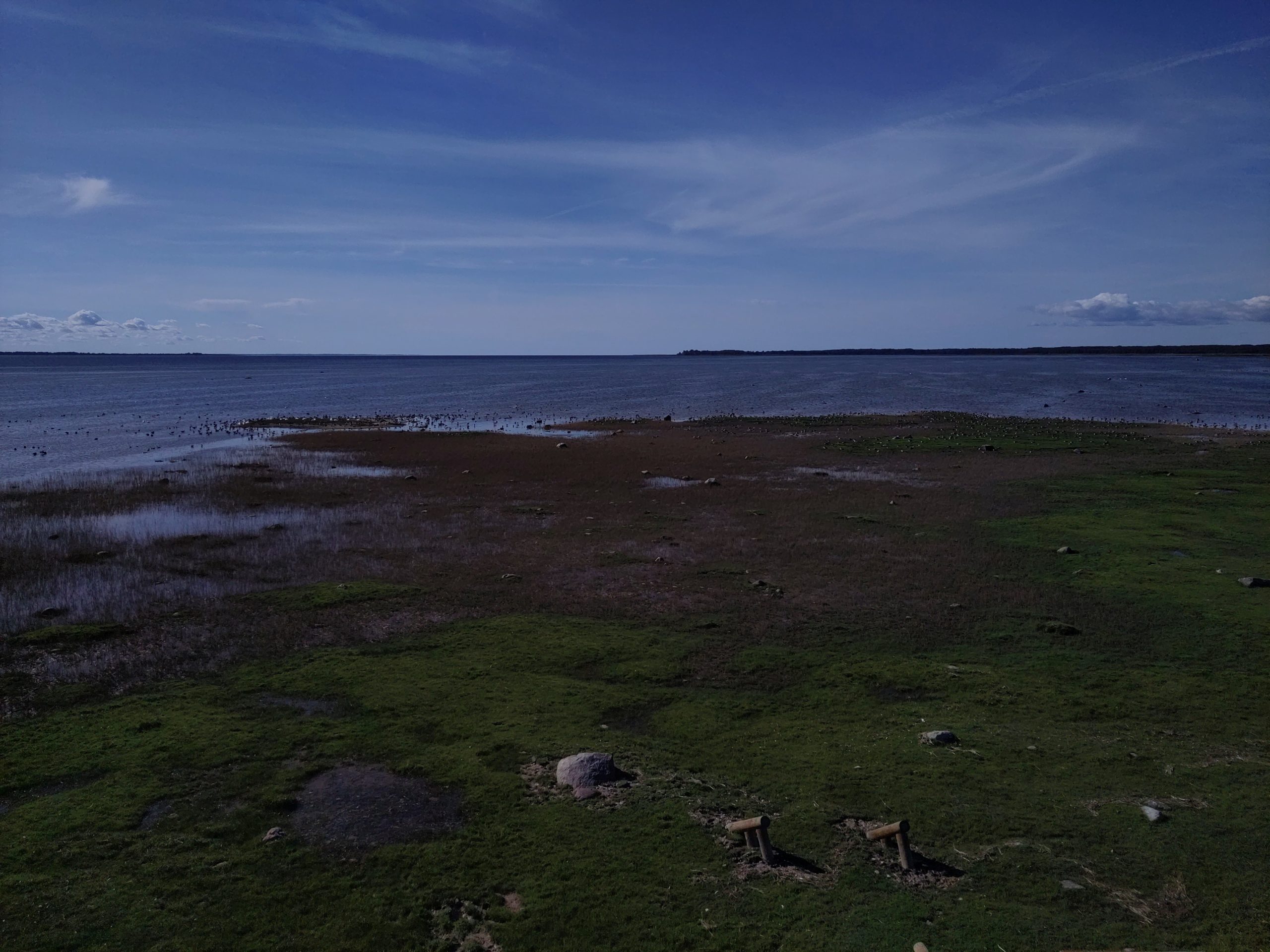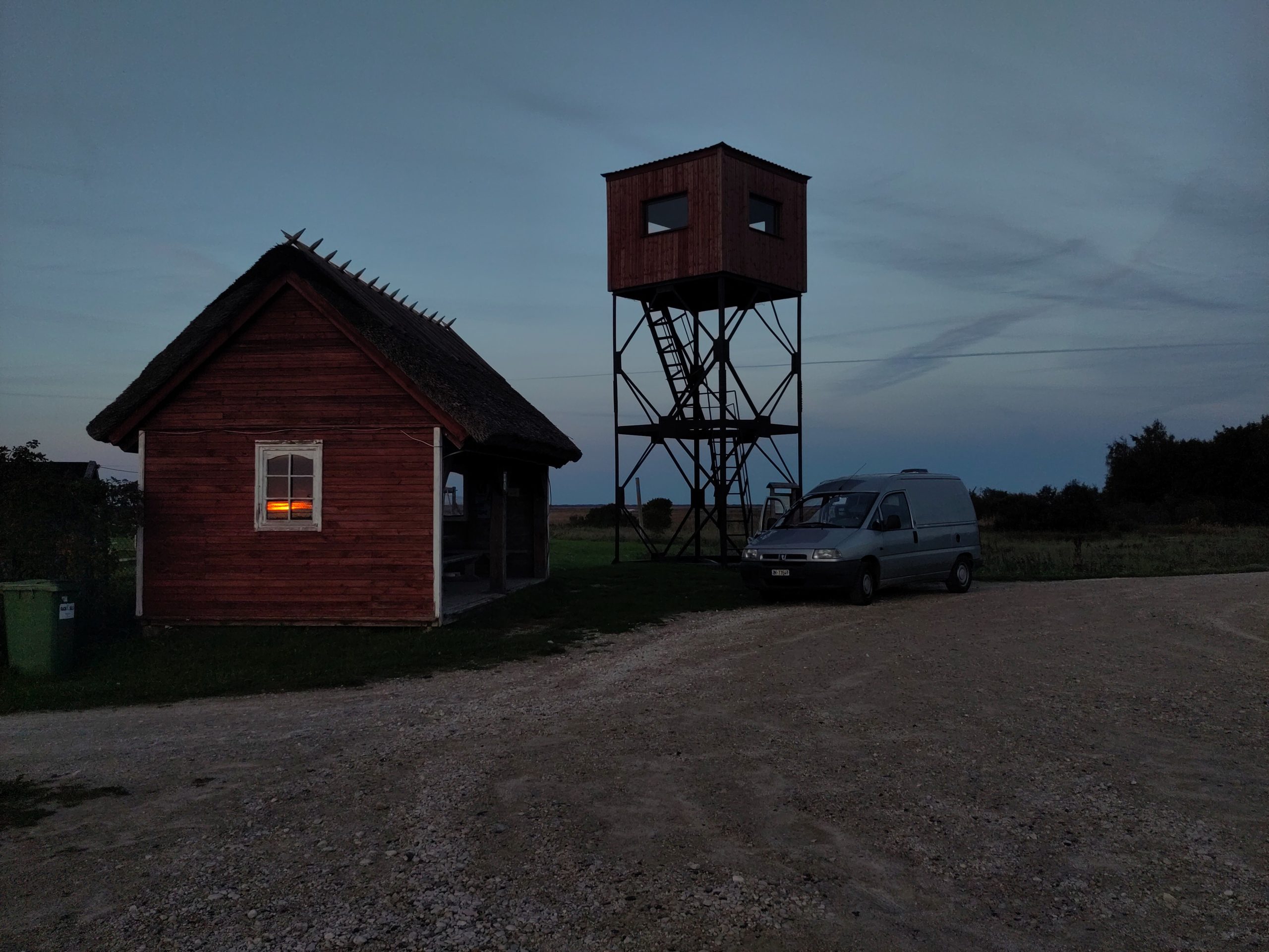 Ich halte noch beim Info-Center in Penjiöe, und das ist eine gute Idee: Auf dem Parkplatz mach ich mir noch einen Kaffee, als ich endlich auf die Ursache des unglaublich lauten Vogellärms komme, den ich zuvor an/in der Scheune verortet hatte: ca. tausend Kraniche machen sich auf, weiterzufliegen, und ich kann ihnen grade noch nachschauen mit meinem Feldi, Wow! Und im Center bestätigt mir eine kompetente Frau, dass gestern ungefahr zweitausend Kraniche gelandet seien, und dass es gut möglich sei, bei dem guten Wetter, sass sie gleich weiterziehen. Ausserdem gibt sie mir Tipps, bei welchem Turm wie das Gelände und was zu sehen ist, und ja, beim Keemu-Turm würden auch immer einige übernachten. Zum Abschluss gibt’s auch noch eine wunderbare Diaschau mit deutschen Voice-over, die alle Vögel und andere Tiere im Jahreszyklus in Matsalu zeigt, wunderbar.