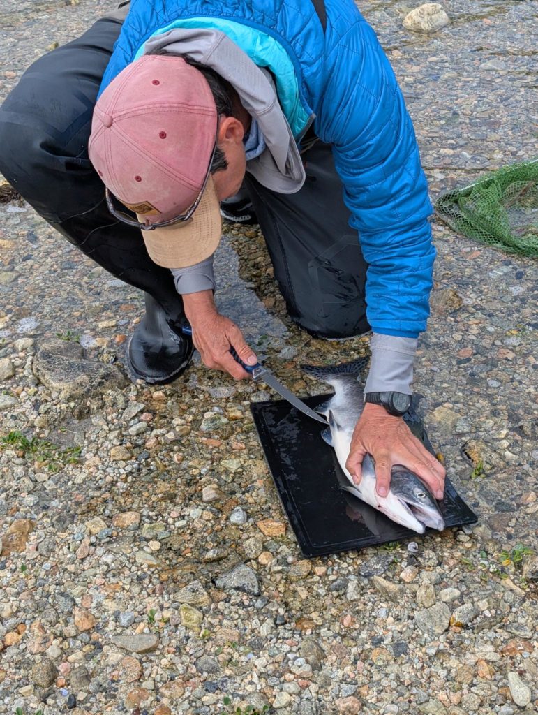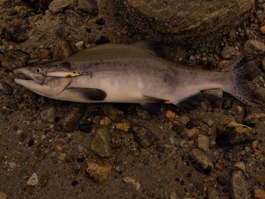 Das wollen wir also auch versuchen, aber am Abend, als wir eintreffen, verliert Gaby zweimal vor den Füssen zwei sehr silbern glänzende Fische, die kämpfen wie verrückt… Entweder weibliche Pinkies oder eben atlantische Lachse.