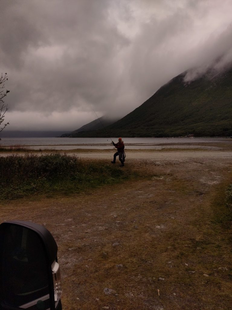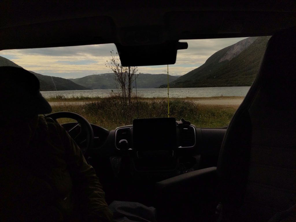 Auch hier waren wir schon, aber erstens müssen wir ja so langsam zurück Richtung Tromsø, zweitens ist der Platz wirklich schön zum Stehen und drittens hat hier Milan seinen Atlantischen Lachs gefangenn