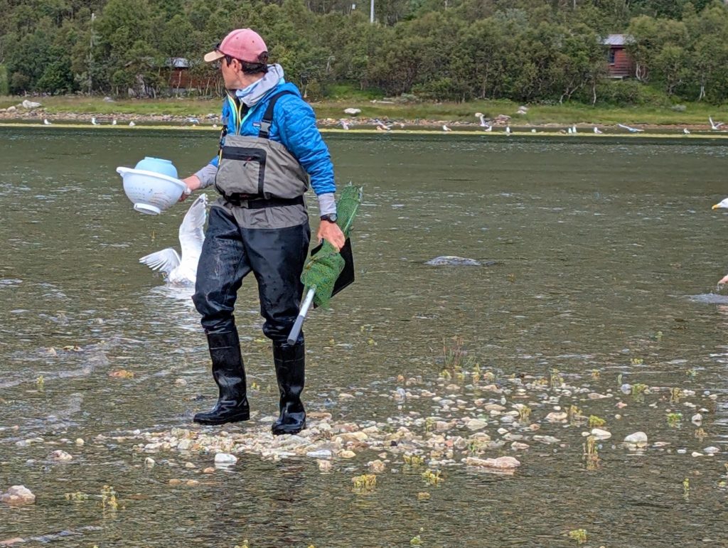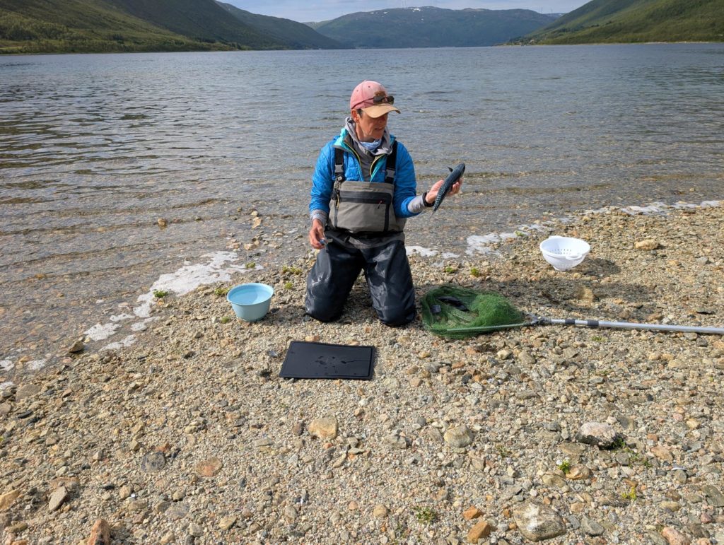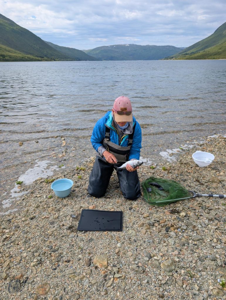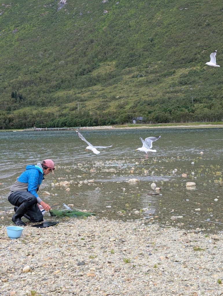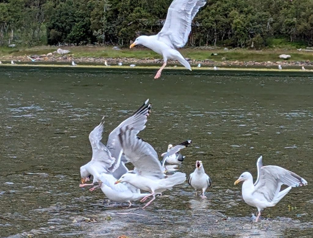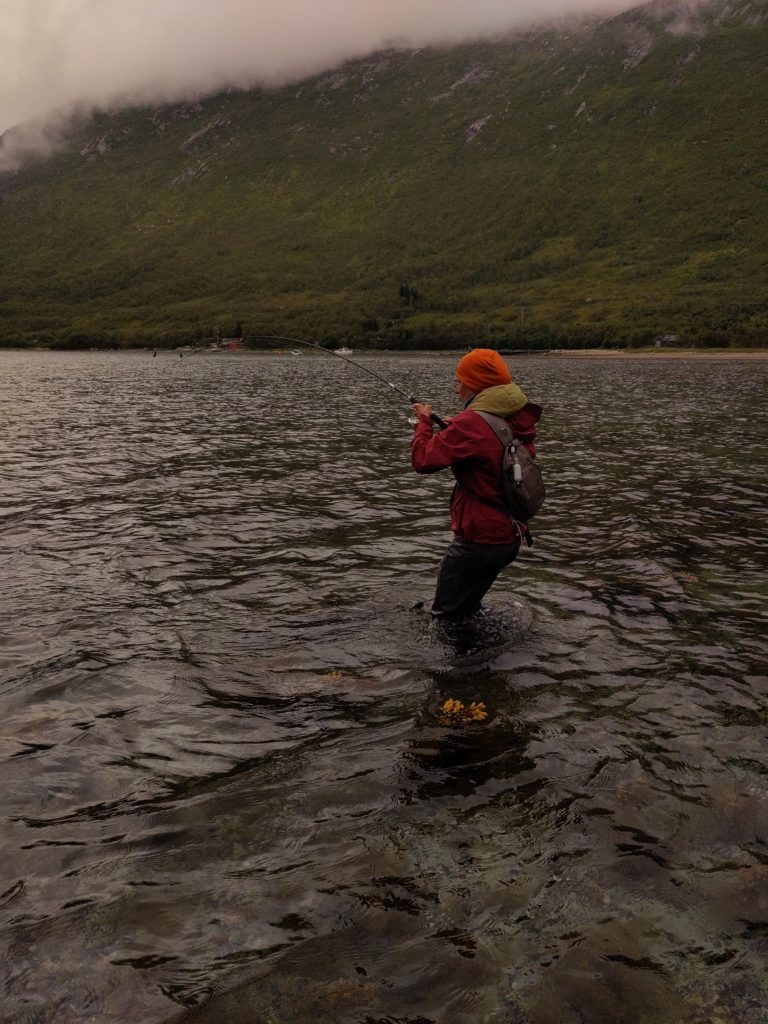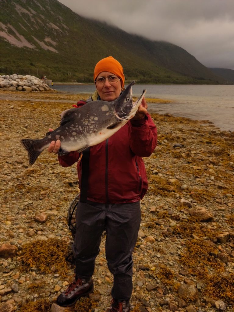 Evtl. aber auch grosse Makrelen, denn am nächsten Morgen angelt Rachel einen kleinen Sei und eine schöne Makrele. Gaby verliert nochmal einen grossen Fisch und bringt dann endlich einen Buckellachs an Land. Nach einem frühen Znacht (Fusilli al Pukkellaks) zieht Rachel nochmal los und fängt auch noch einen Buckellachs, der verschenkt wird, und um neun fallen wir ins Bett. Morgen ist das erste Mal seit Wochen wieder Regen angesagt, und wir werden Tromsø unsicher machen. Kino, undichte Stiefel eintauschen, Käfele… Und dann je nach Wetter nochmal klettern oder Wandern, um zum Schluss nochmal den Barduelva zu beangeln, diesmal mit der Fliege.