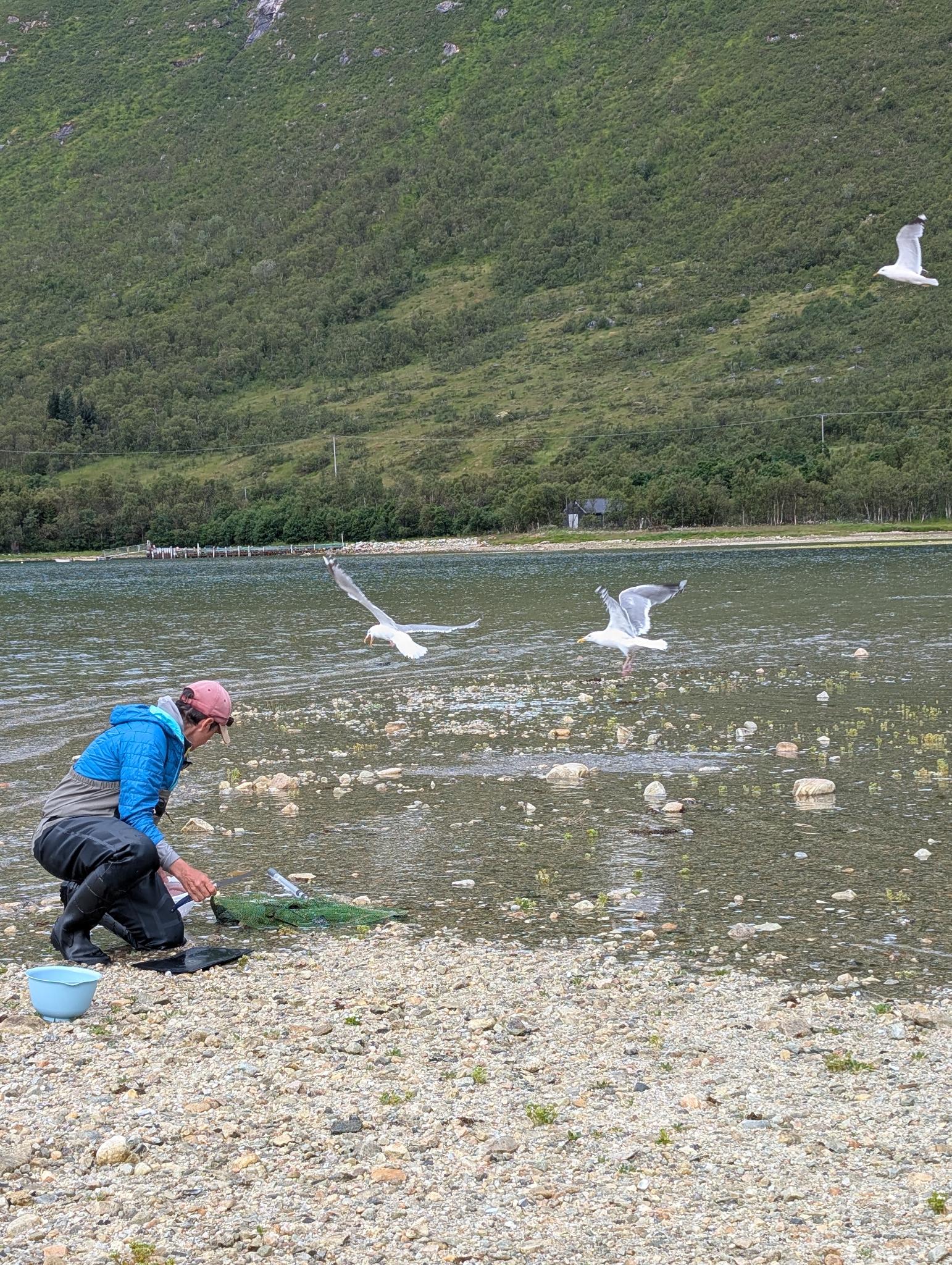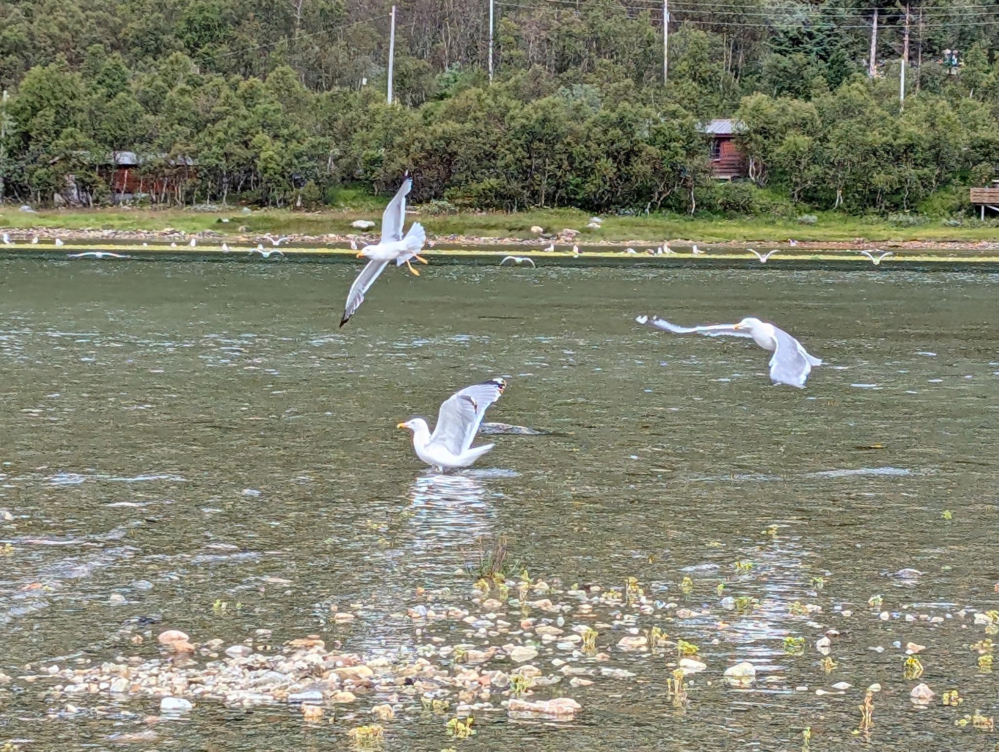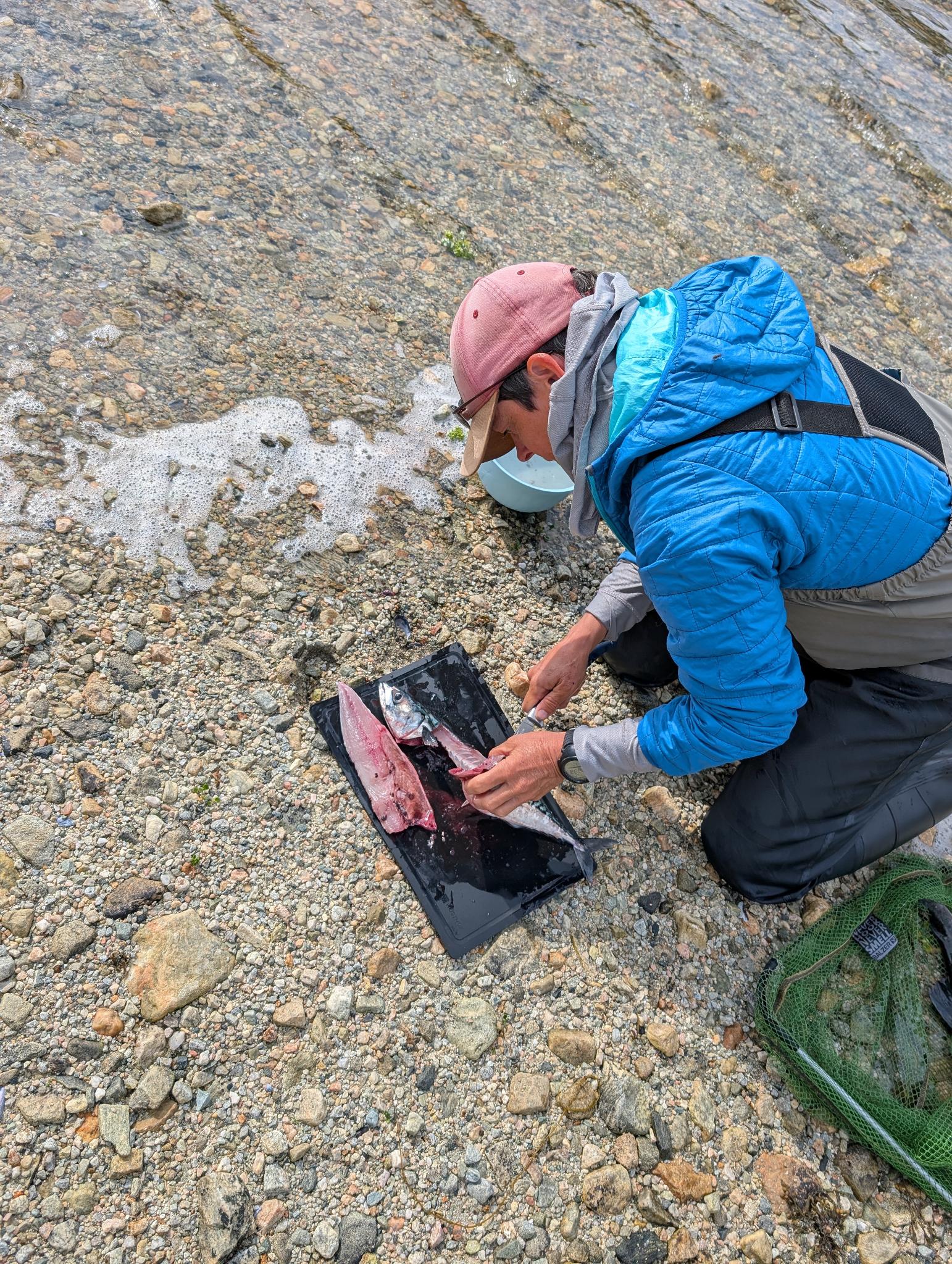 Evtl. aber auch grosse Makrelen, denn am nächsten Morgen angelt Rachel einen kleinen Sei und eine schöne Makrele. Gaby verliert nochmal einen grossen Fisch und bringt dann endlich einen Buckellachs an Land. Nach einem frühen Znacht (Fusilli al Pukkellaks) zieht Rachel nochmal los und fängt auch noch einen Buckellachs, der verschenkt wird, und um neun fallen wir ins Bett. Morgen ist das erste Mal seit Wochen wieder Regen angesagt, und wir werden Tromsø unsicher machen. Kino, undichte Stiefel eintauschen, Käfele… Und dann je nach Wetter nochmal klettern oder Wandern, um zum Schluss nochmal den Barduelva zu beangeln, diesmal mit der Fliege.