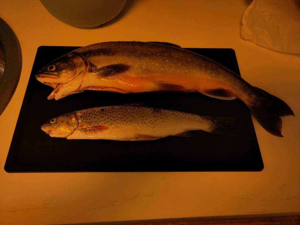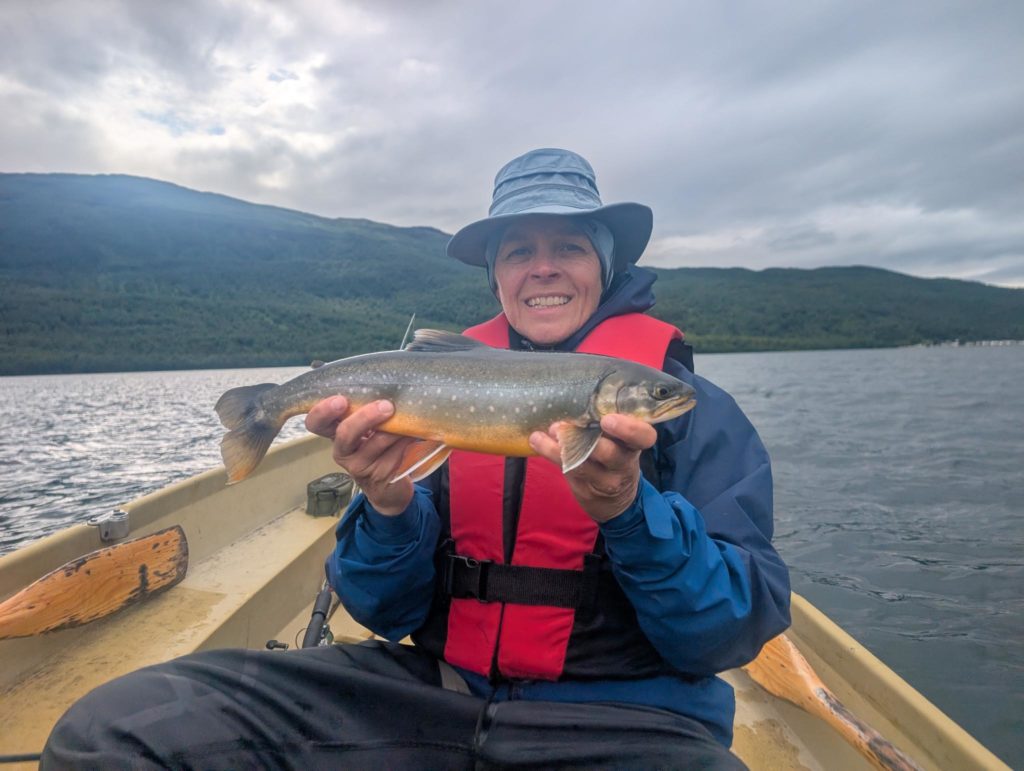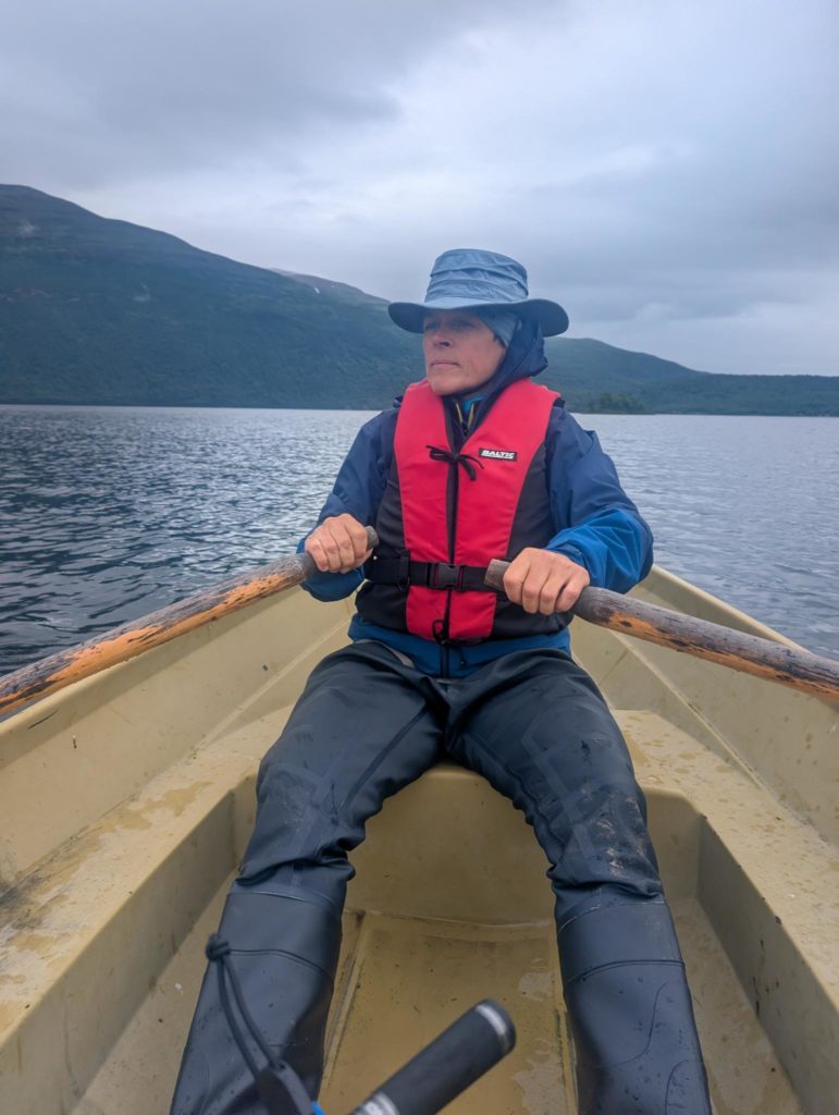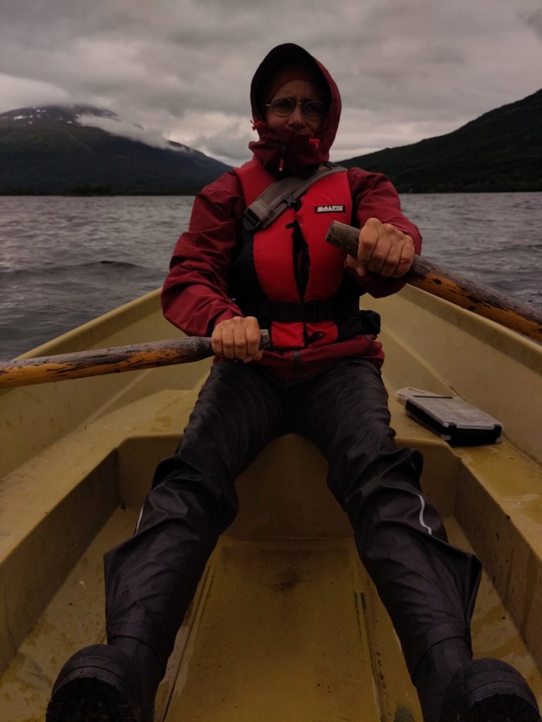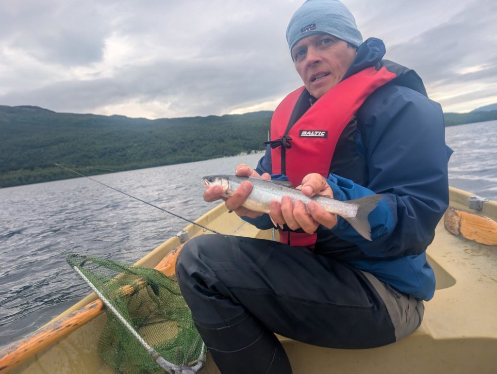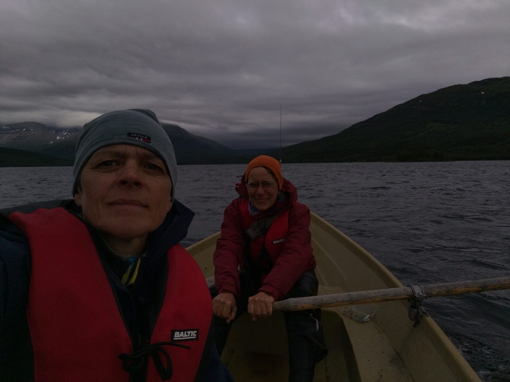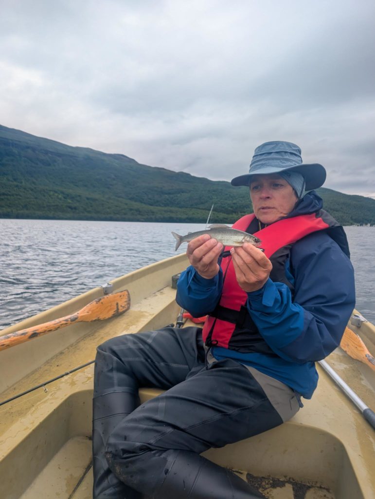 Die veritable Drift- und Ruderfischerei schlug bei Gaby ein wie eine Bombe: erst eine kleine Äsche (die allererste ever!), die wir anfänglich wg. angelegter Rückenflosse als Felche fehlzuordneten, dann kurz darauf ein fetter Seesaibling (Arctic char, auch Premiere) und eine Weile später nochmal ein kleiner Saibling.