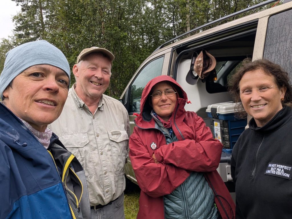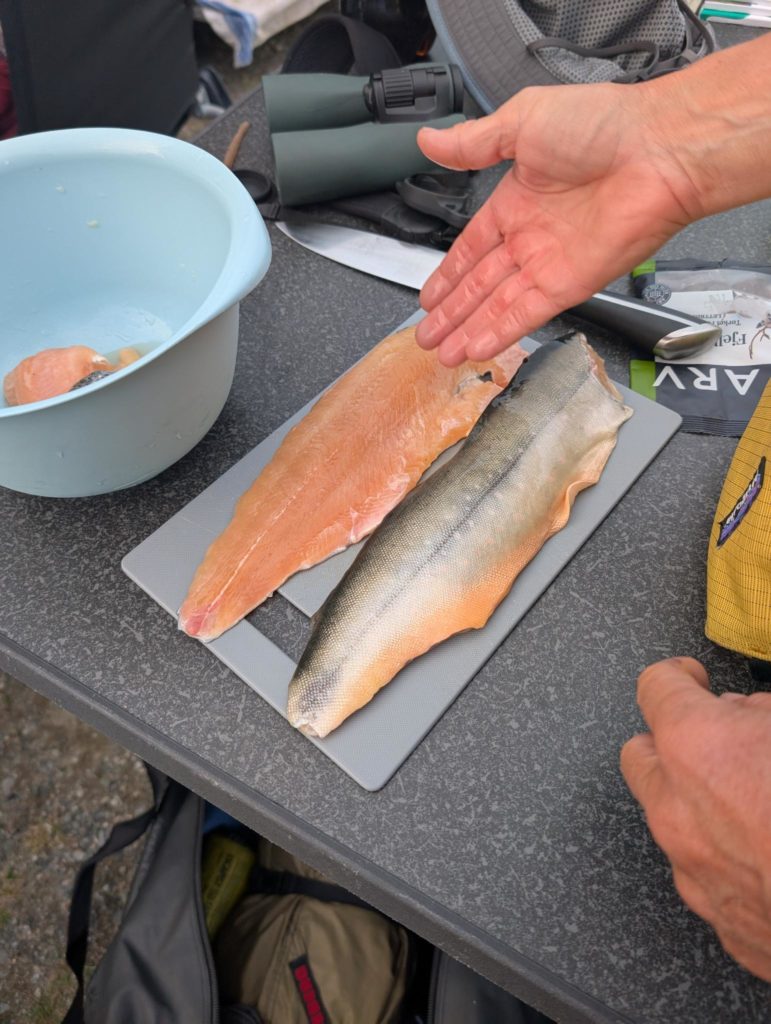An unserem letzten Campingstop, wo Grauwasser entsorgt und am Abend gepackt werden muss für die morgendliche Abgabe des Campers und Flughafentransfer, regnet es erst mal in Strömen, und unsere Angellust an dem flachen See ist bescheiden. Obwohl wir davor Bekanntschaft gemacht haben mit Joe und Lina, einem norwegischen Fischerpaar, das am selben Lachsfluss sich zum Fischen bereitmachte, wo wir kurz zum schauen anhielten. Nach einer guten Stunde quasseln/Austausch zogen sie dann los, wir beschenkt mit zwei von Joe gebundenen, Lachserprobten Fliegen (inline rig, für Nerds). Sie erbten dafür Rachels halbdichte Wathose und die Berg-/Watschuhe, die wir sowieso zurücklassen wollten.